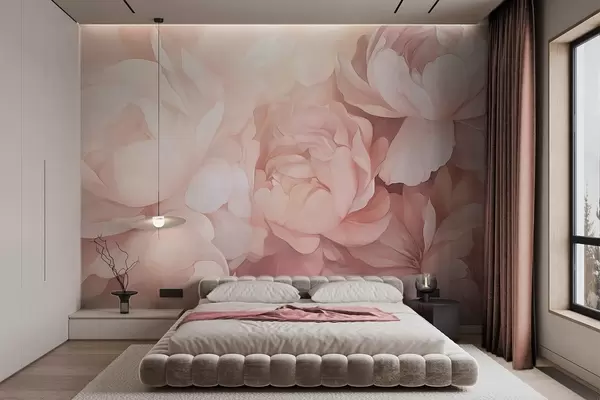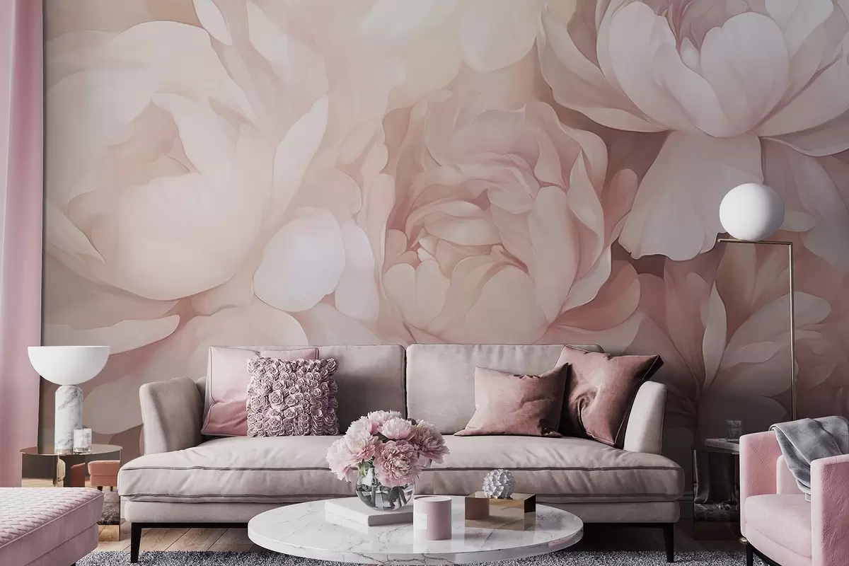 Fototapetes Gaiši pasteļrozā peonijas ar maigiem, smalkiem ziedlapiņām ar maigu tekstūru, kas sakārtotas cieši kopā, veidojot blīvu ziedu mākslas darbu, maigs apgaismojums Nr. w09319