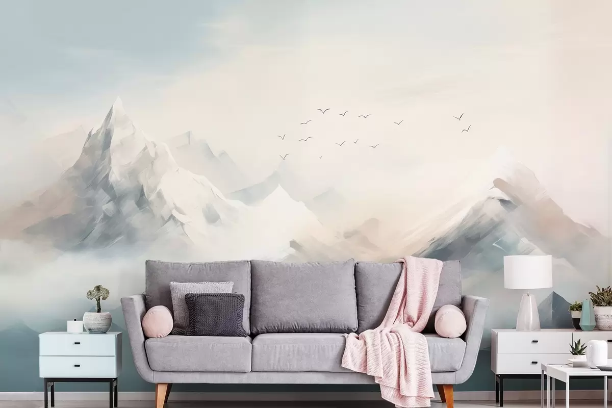 Fototapetes Sniegotas kalnu virsotnes rīta miglā ar lidojošiem putniem Nr. w09326
