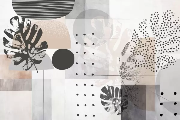 Fototapetes Abstraktā apdruka ar ģeometriskām formām un tropu lapām, apļiem, punktiņiem un līnijām, moderns un minimālisma dizains Nr. w09333