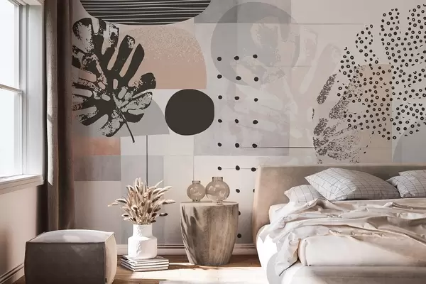 Fototapetes Abstraktā apdruka ar ģeometriskām formām un tropu lapām, apļiem, punktiņiem un līnijām, moderns un minimālisma dizains Nr. w09333