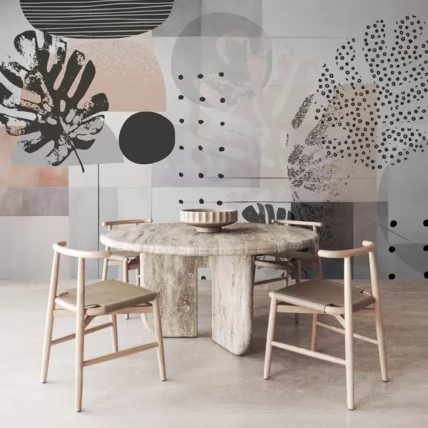Fototapetes Abstraktā apdruka ar ģeometriskām formām un tropu lapām, apļiem, punktiņiem un līnijām, moderns un minimālisma dizains Nr. w09333