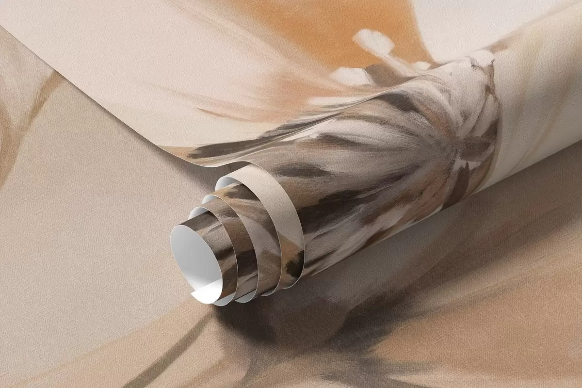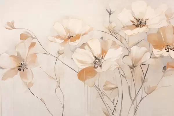 Fototapetes Balti un oranži teksturēti ziedi ar gariem kātiņiem, gaišs fons, maigas krāsas, eleganta kompozīcija, maigi triepieni ar otu Nr. w09335