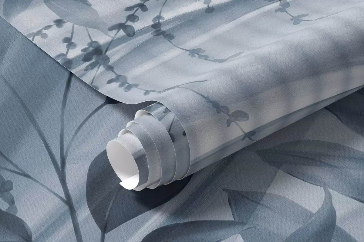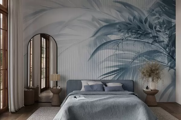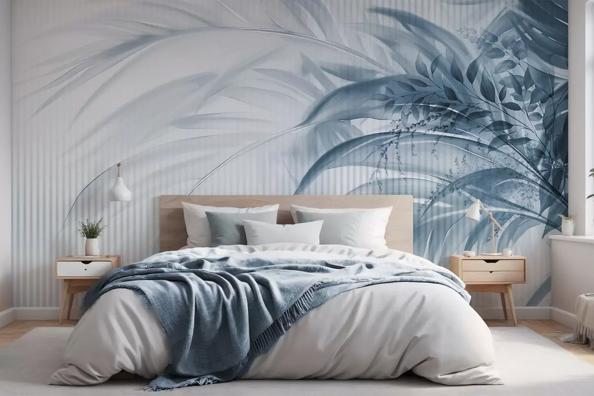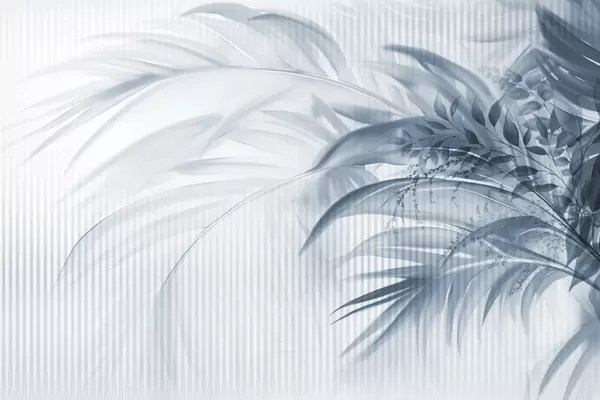 Fototapetes Palmu tropu zilās lapas ar baltu svītrainu fonu, maigs apgaismojums, smalki triepieni, organiskas formas Nr. w09343v1