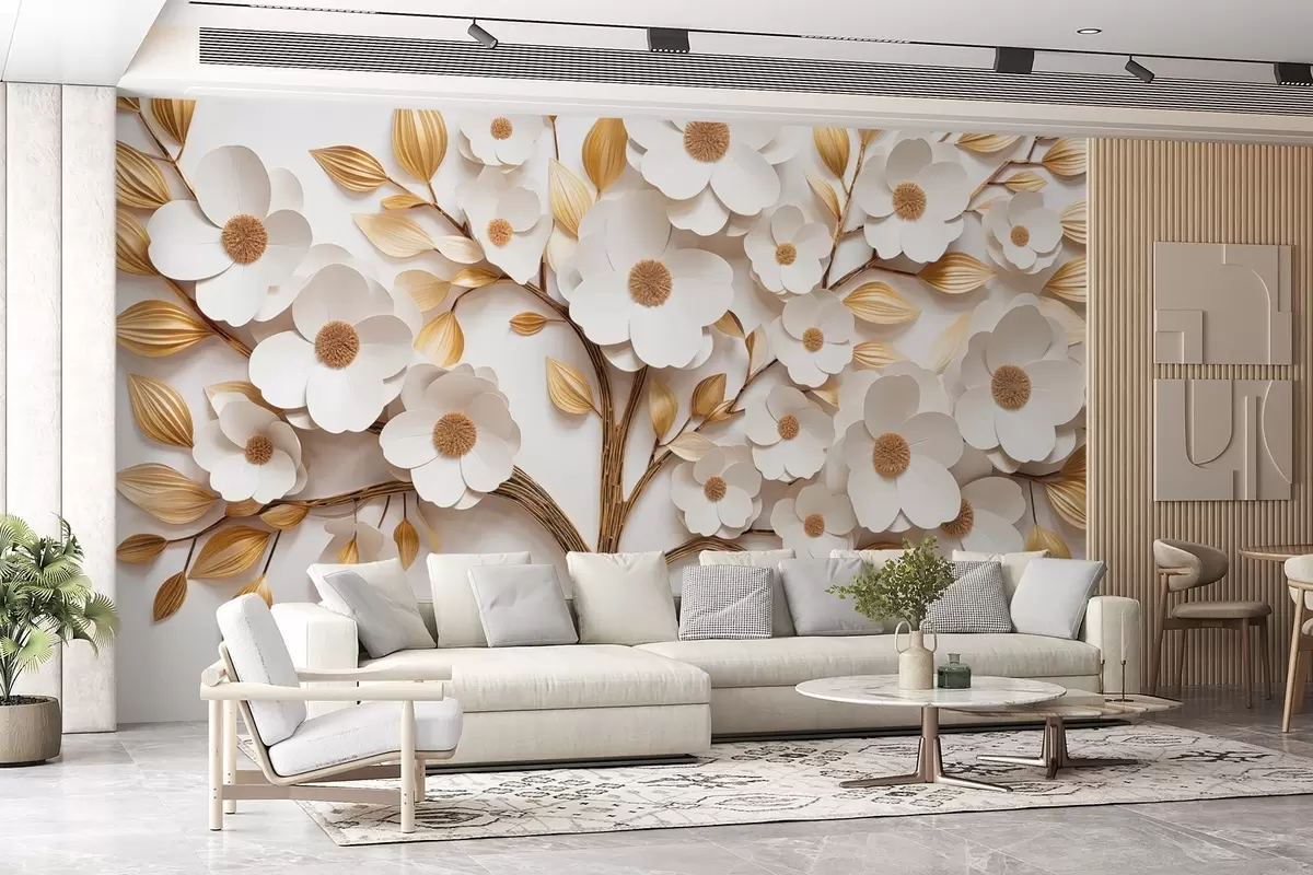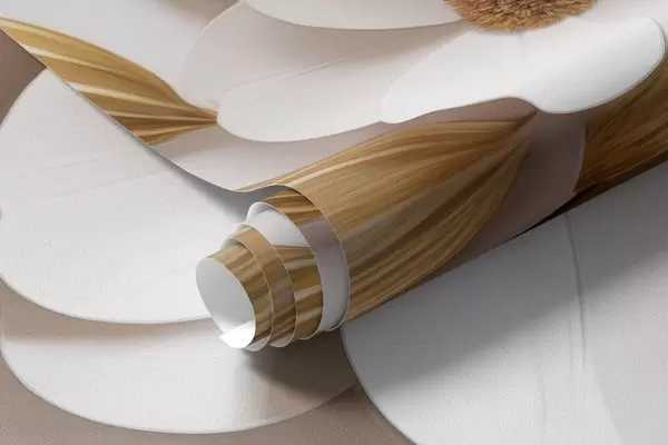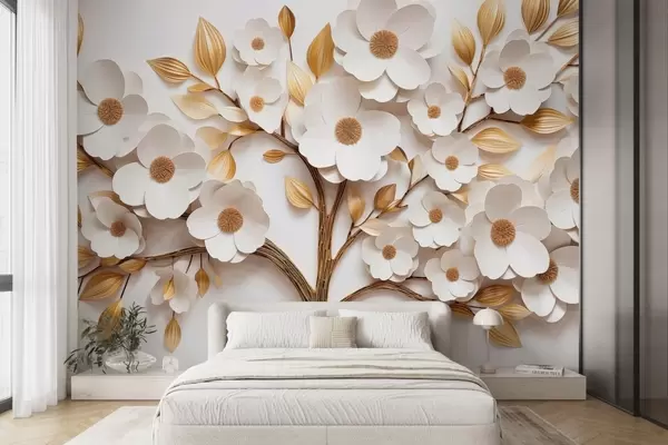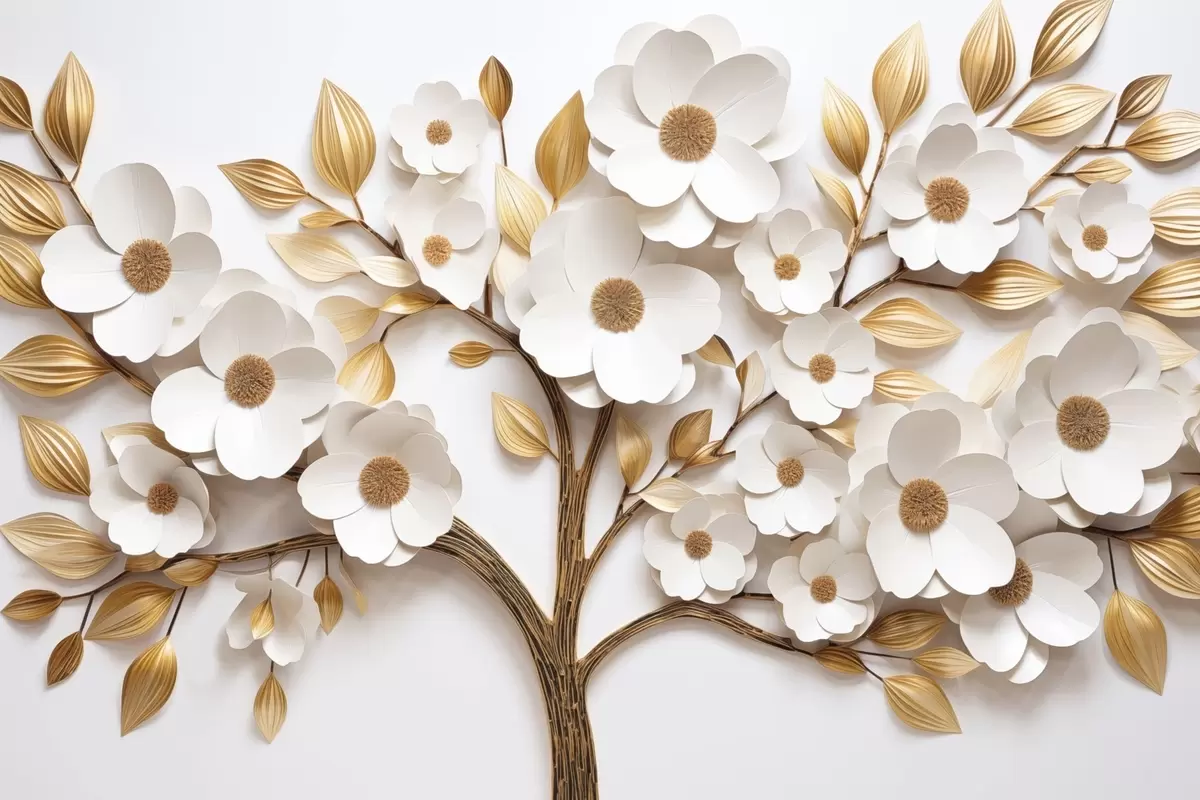 Fototapetes Koks ar baltiem ziediem un reljefa lapu imitāciju Nr. w09348