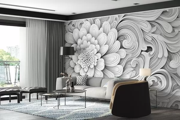 Fototapetes Dekoratīvs melnbalts raksts zieda un virpuļu formā Nr. w09355