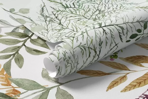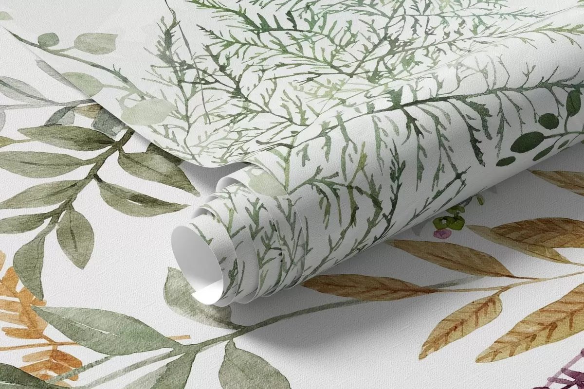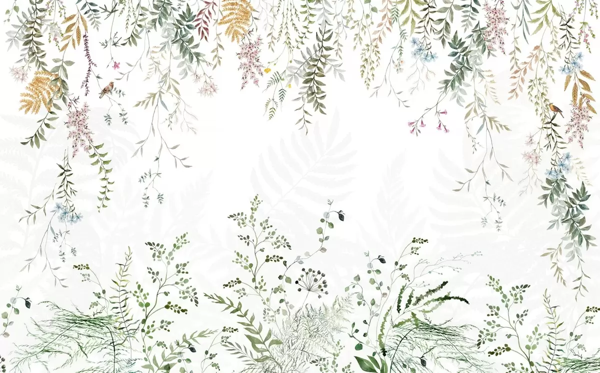 Fototapetes Botāniska ilustrācija ar papardēm, zāli un piekārtiem augiem, pasteļtoņos, uz balta fona, akvareļa tekstūras stilā Nr. w09364