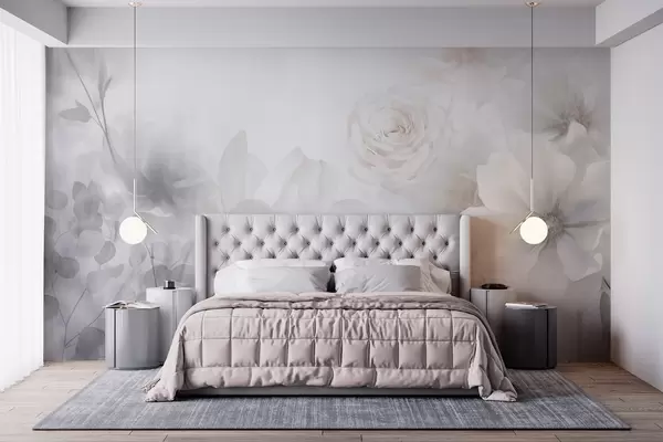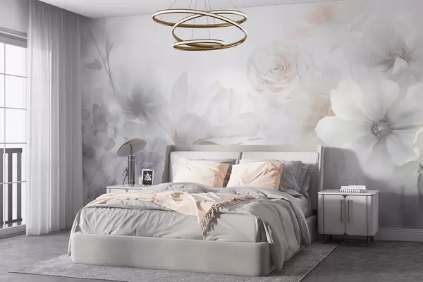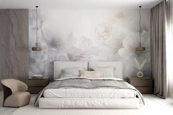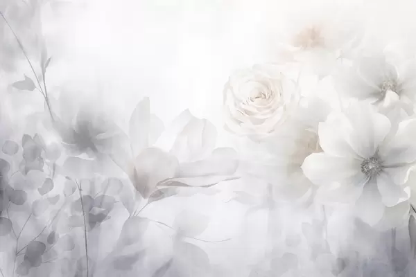 Fototapetes Smalks abstrakts ziedu kompozīcija ar pasteļrozā rozēm un magnolijām, mīksts fokuss, gaiši pelēks fons Nr. w09371