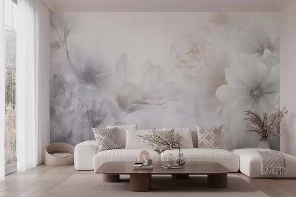 Fototapetes Smalks abstrakts ziedu kompozīcija ar pasteļrozā rozēm un magnolijām, mīksts fokuss, gaiši pelēks fons Nr. w09371