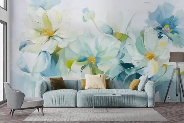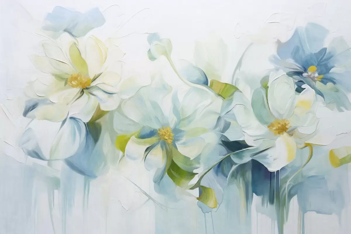 Fototapetes Abstraktie balti un zili ziedi ar dzelteniem ziedpumpuriem un zaļām lapām baltā fonā, teksturētas glezniecības stilā Nr. w09372