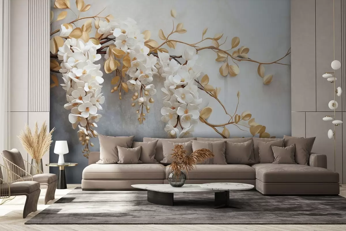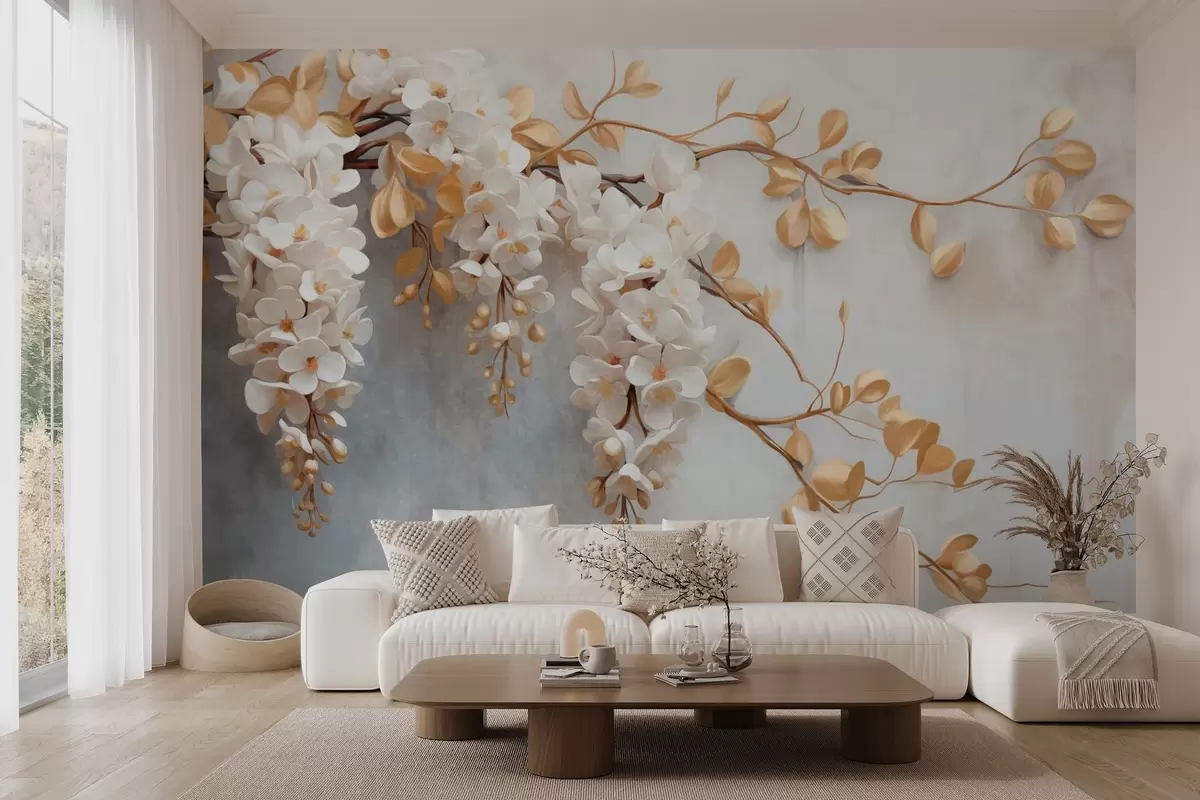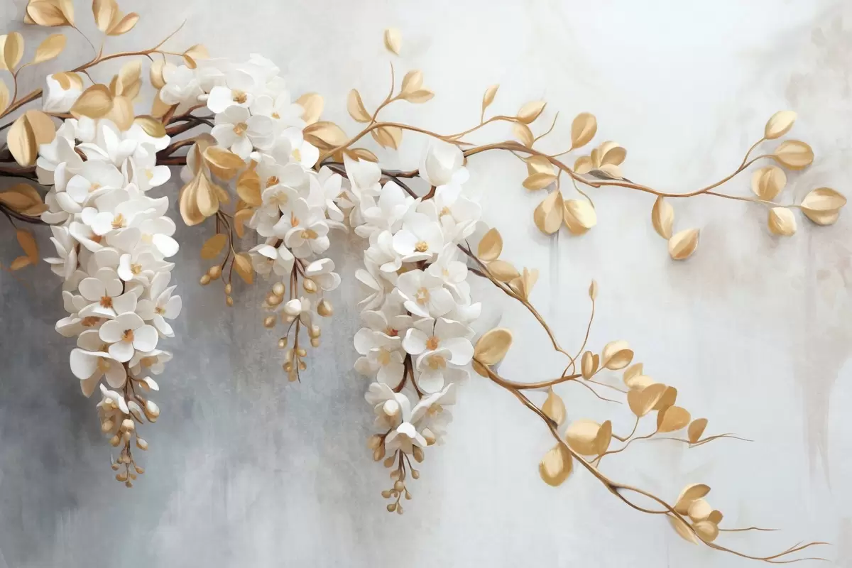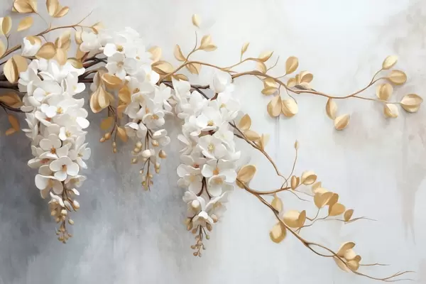 Fototapetes Balti vistērijas ziedi ar dzeltenām lapām uz zara, kaskādes uz leju pret fakturētu baltu fonu, maigi ziedlapiņas Nr. w09381