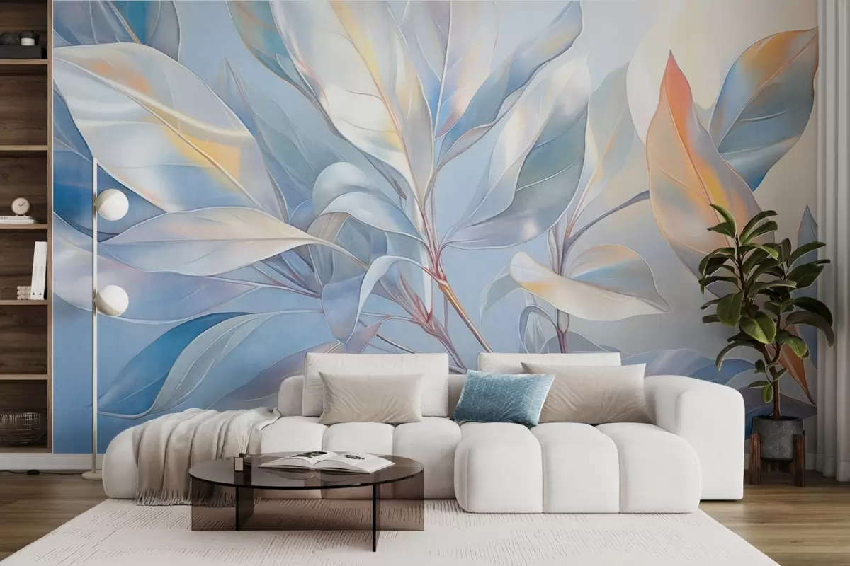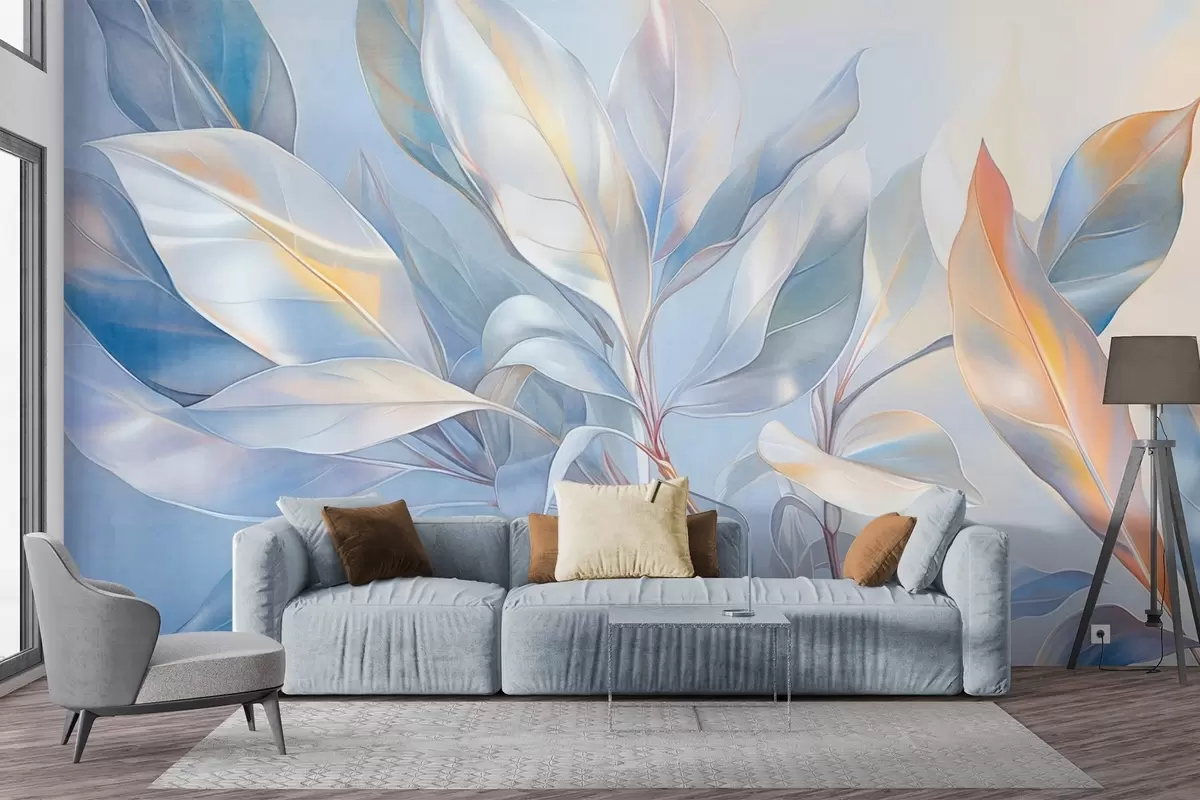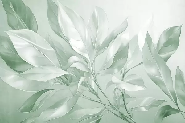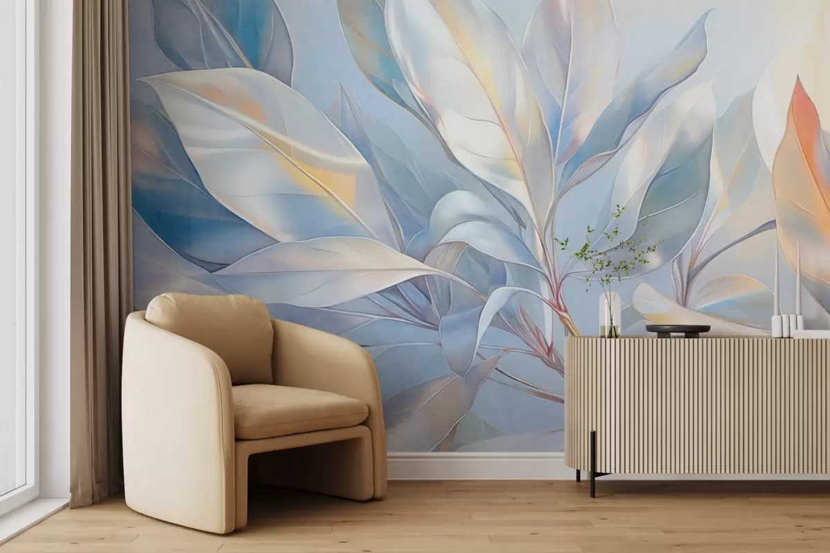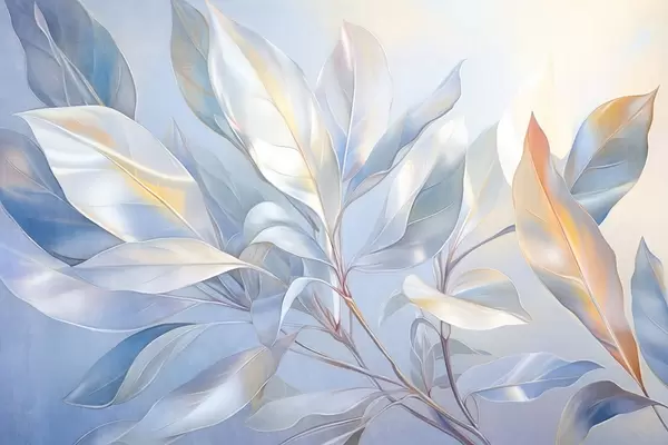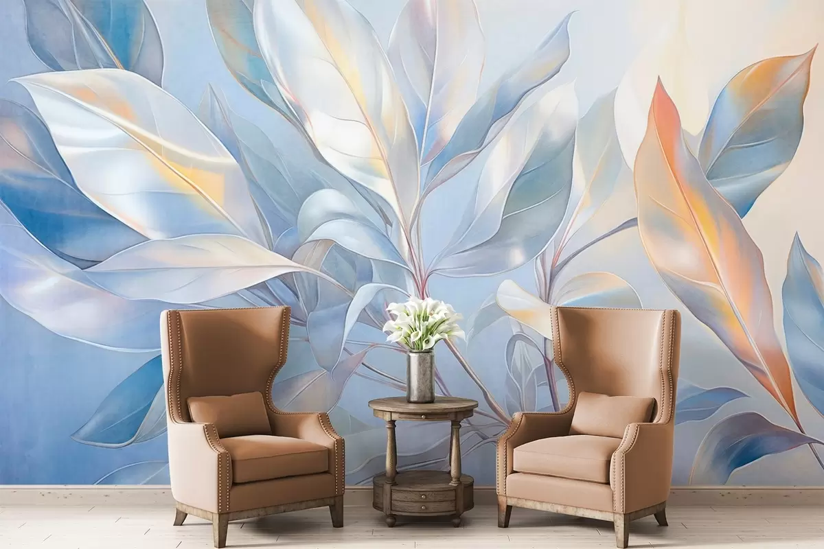 Fototapetes Magnolijas lapas ar baltiem un ziliem toņiem, maigs apgaismojums, eleganta kompozīcija, detalizētas lapu dzīslas, mākslinieciski triepieni ar otu Nr. w09385
