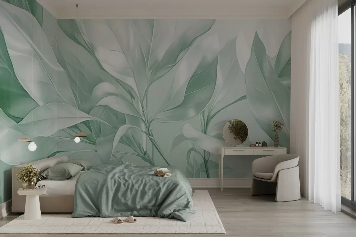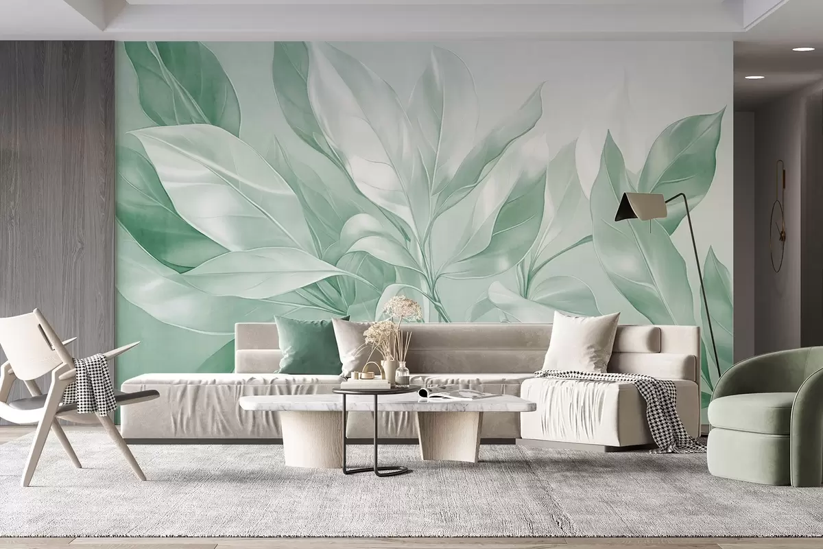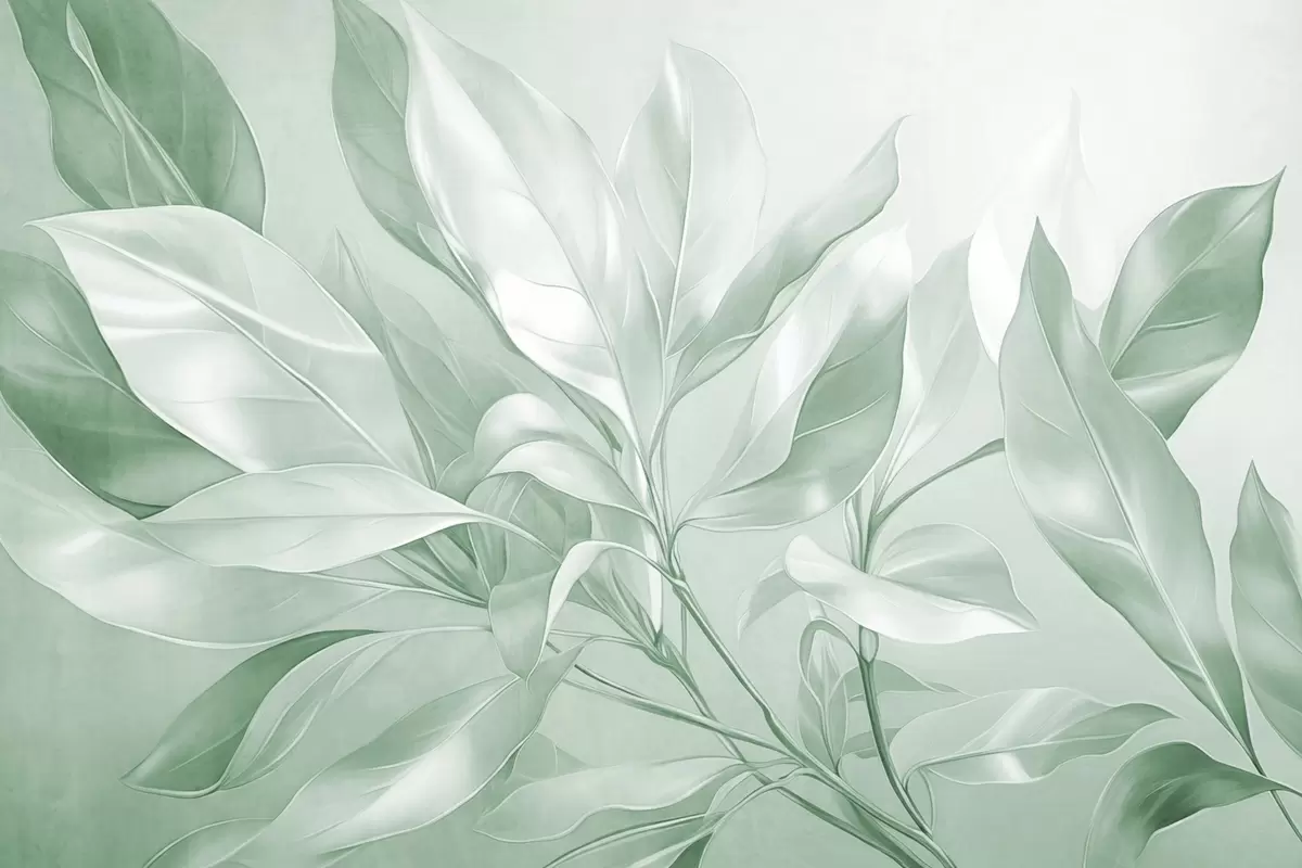 Fototapetes Magnolijas lapas ar baltiem un zaļiem toņiem, maigs apgaismojums, eleganta kompozīcija, detalizētas lapu dzīslas, mākslinieciski triepieni ar otu Nr. w09385v1