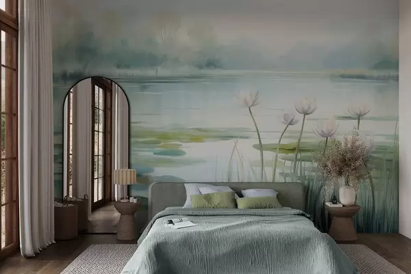 Fototapetes Ainava ar ezeru, ūdensrozes un ūdensrožu lapas, koki fonā, mierīgā vidē, gaiši zili un zaļi toņi Nr. w09395