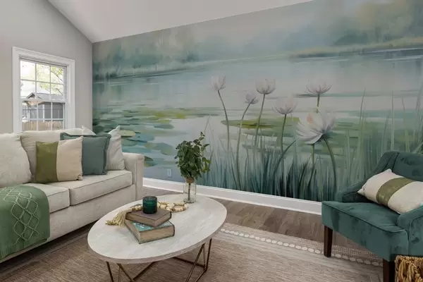 Fototapetes Ainava ar ezeru, ūdensrozes un ūdensrožu lapas, koki fonā, mierīgā vidē, gaiši zili un zaļi toņi Nr. w09395