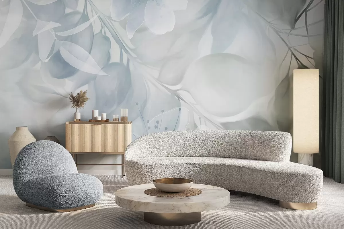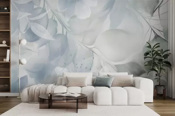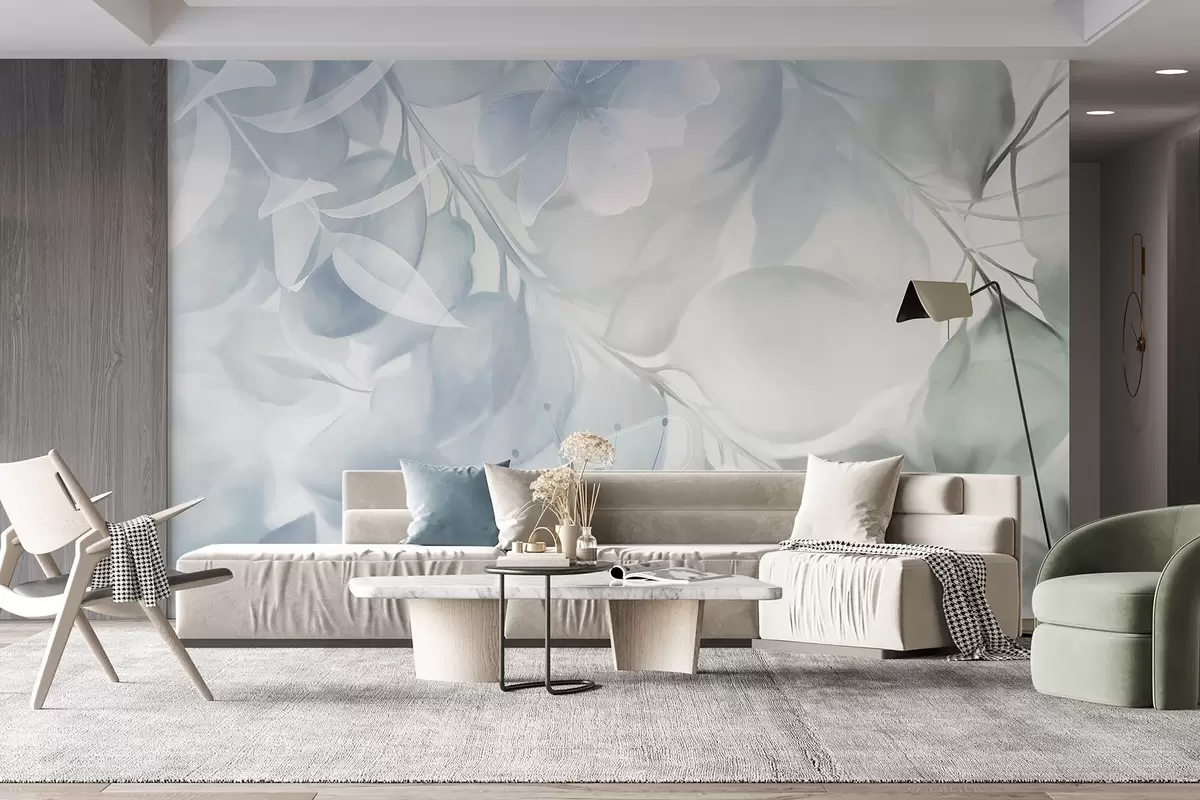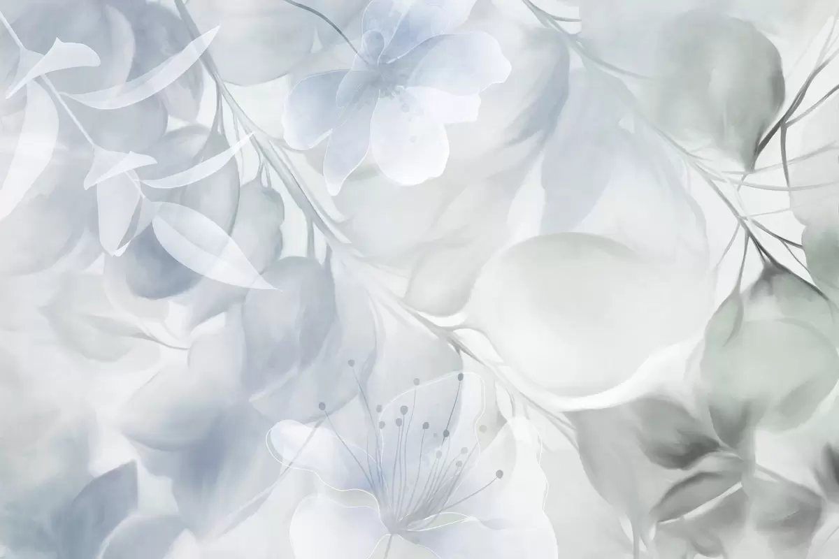 Fototapetes Ziedu māksla ar klusinātiem ziliem un zaļiem ziediem, lapām un zariem, maigām pasteļtoņos krāsām, akvareļa tekstūras efektu Nr. w09397v1