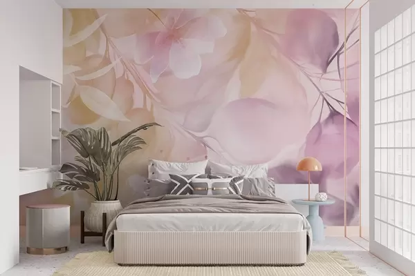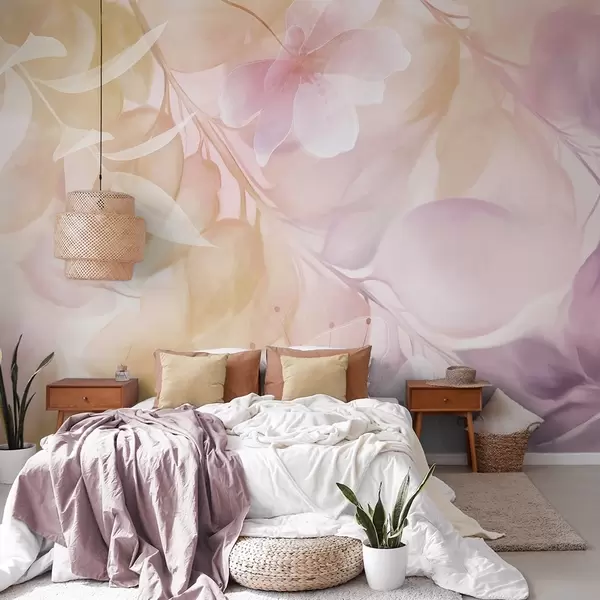 Fototapetes Ziedu māksla ar klusinātiem dzelteniem un violeti ziediem, lapām un zariem, maigām pasteļtoņos krāsām, akvareļa tekstūras efektu Nr. w09397v2