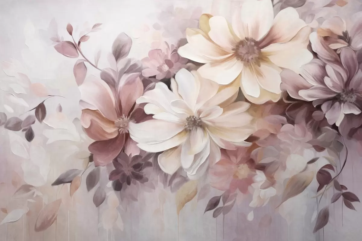 Fototapetes Ziedu kompozīcija ar lieliem, teksturētiem, maigi krāsainiem ziediem bordo, persiku un baltā krāsā, ar delikātiem lapām Nr. w09398