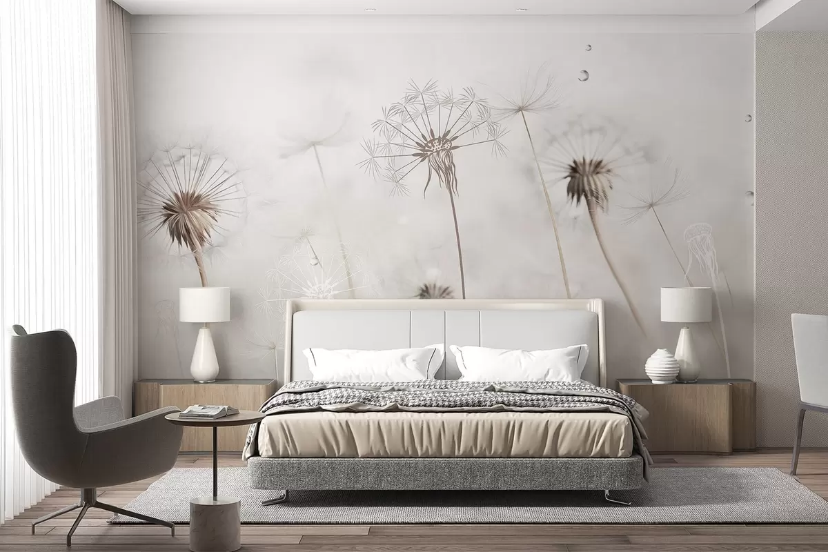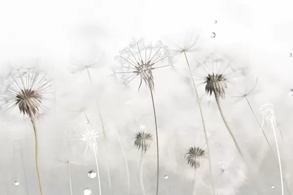 Fototapetes Pienene ar ūdens pilieniem, balts fons, tuvu uzņemts, maiga gaisma, daba, botānika, ēterisks, delikāts, minimālisma stils Nr. w09399