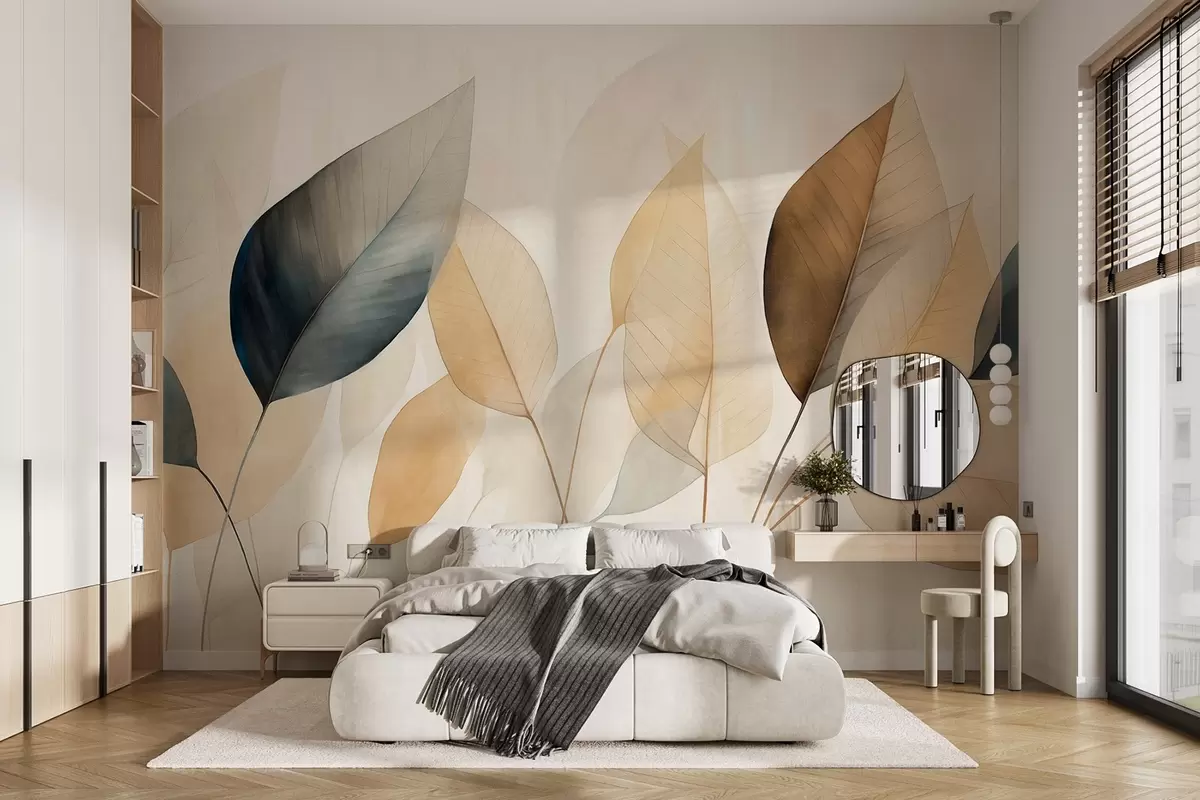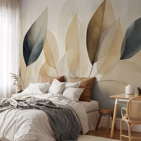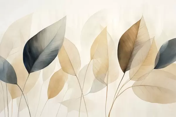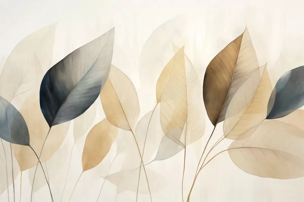 Fototapetes Teksturēta glezna, kas imitē lapas brūnos, dzeltenos un pelēkos toņos, ar smalkām vēnām un kātiņiem Nr. w09400