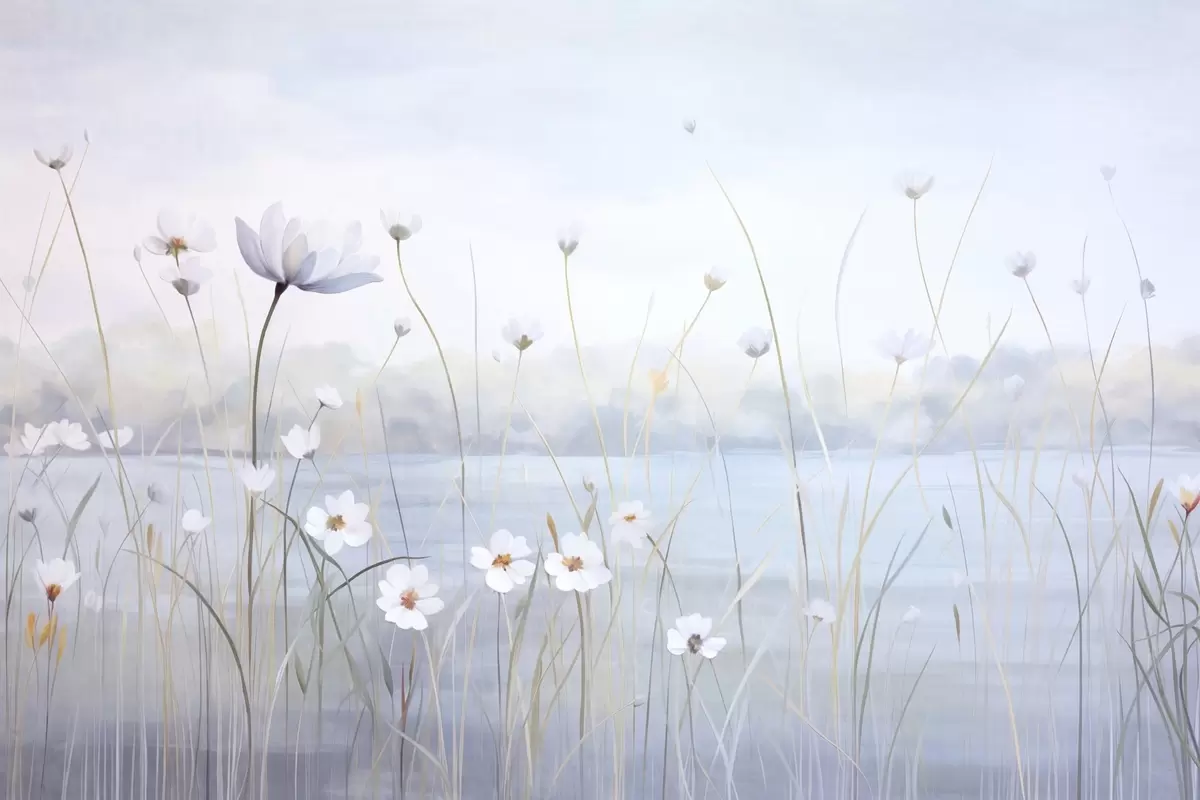 Fototapetes Baltas puķes ar garām kātiņām laukā, gaiši zils debesis, maigas krāsas, faktūru, minimālisma stils, iedvesmojies no dabas, mierīgs fons Nr. w09401