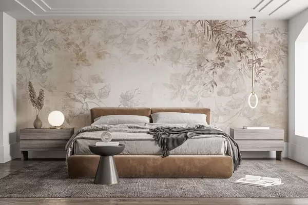 Fototapetes Vintage teksturēta ziedu māksla ar zīmējuma stila delikātu dārza ziedu un lapu ilustrācijām, maigiem pasteļtoņos un sēpijas toņos w09402