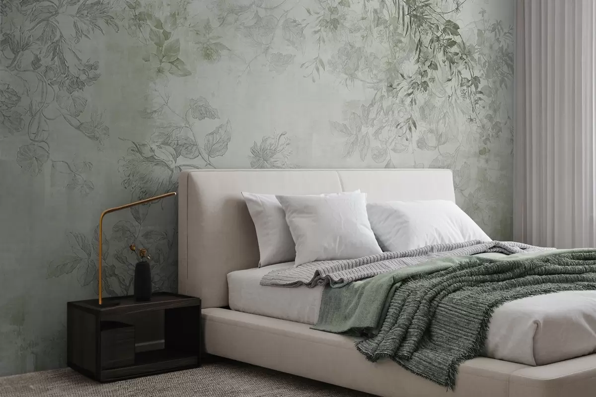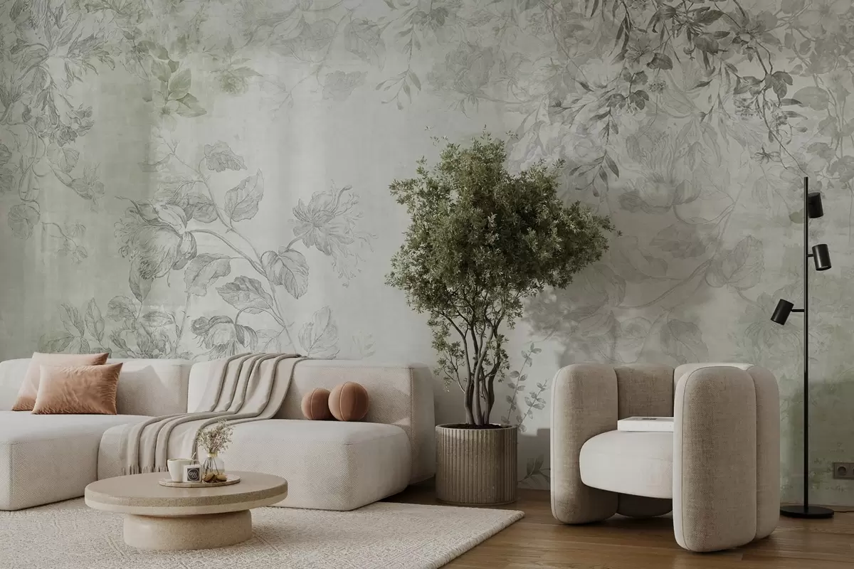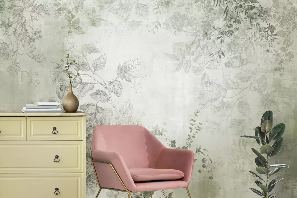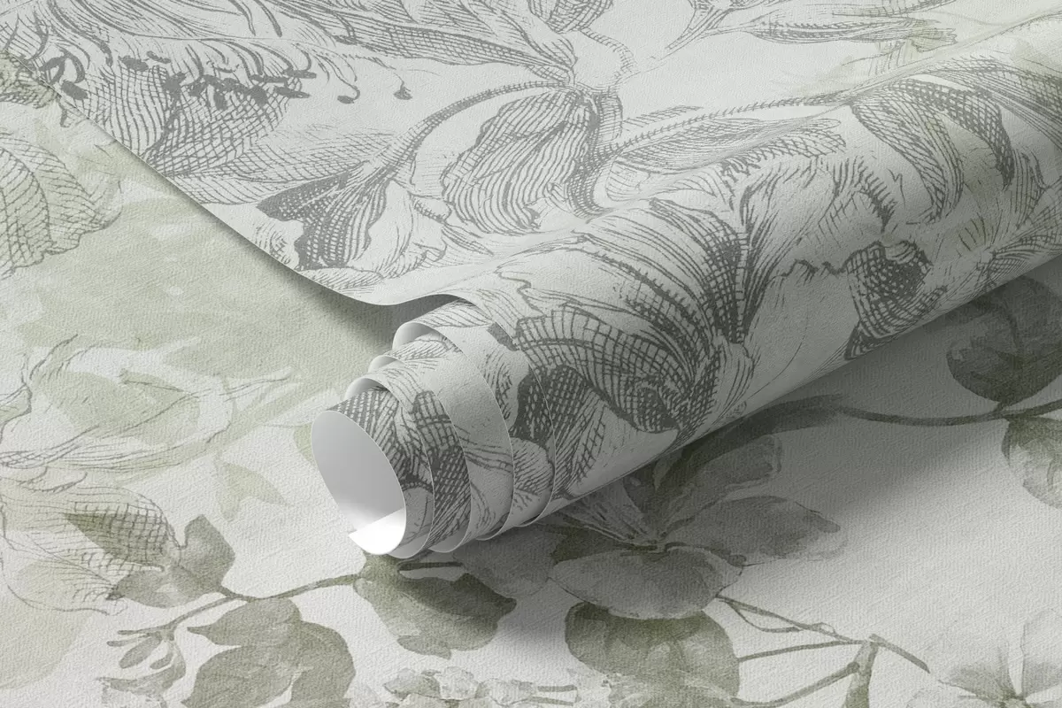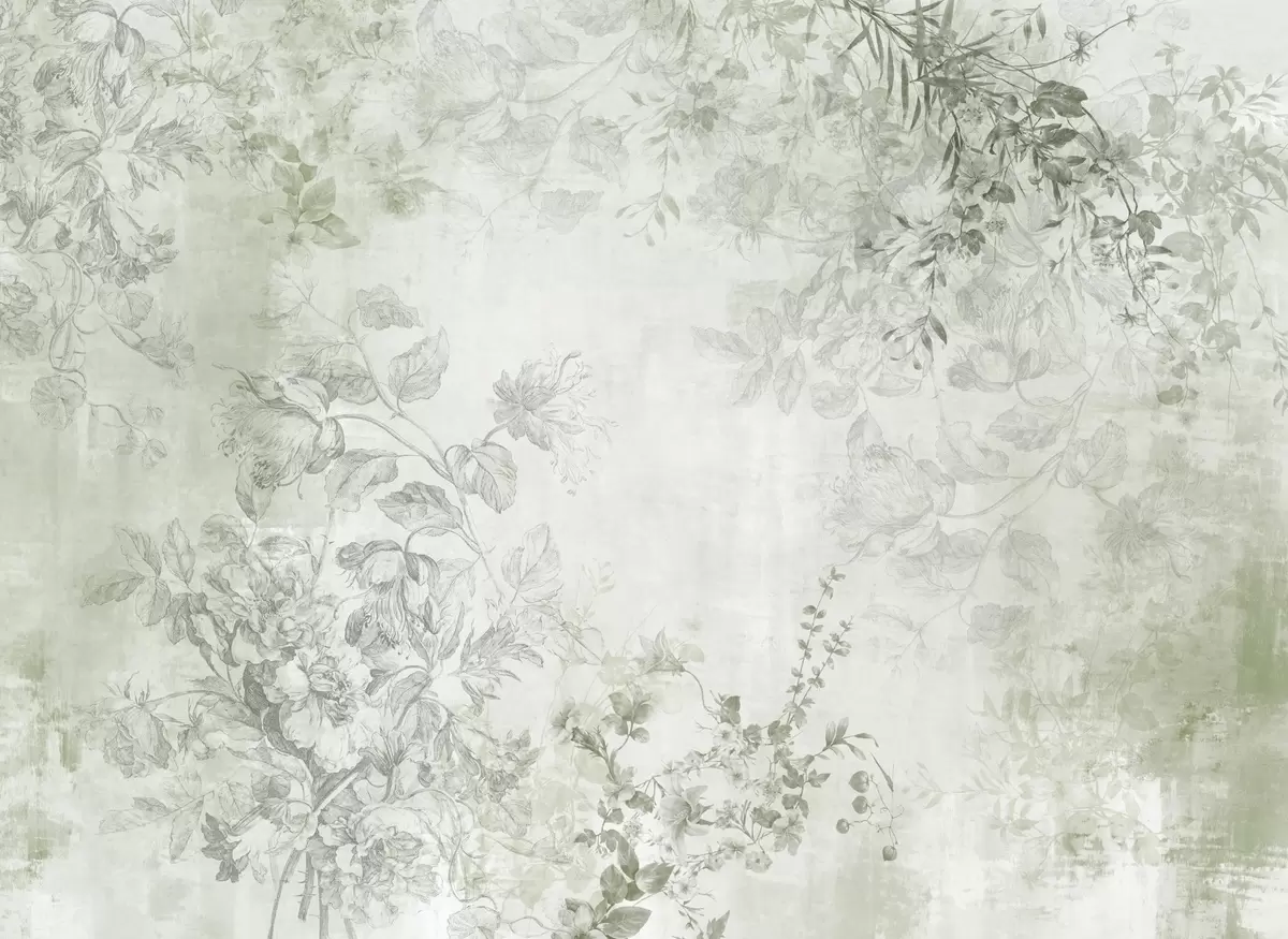 Fototapetes Vintage teksturēta ziedu māksla ar zīmējuma stila delikātu dārza ziedu un lapu ilustrācijām, maigi zaļos toņos Nr. w09402v2