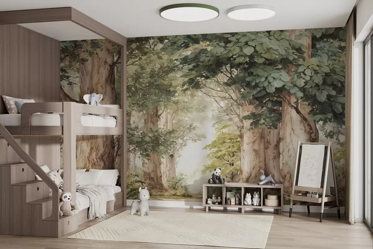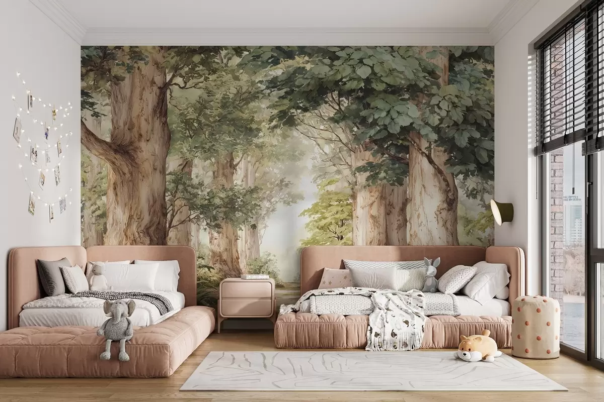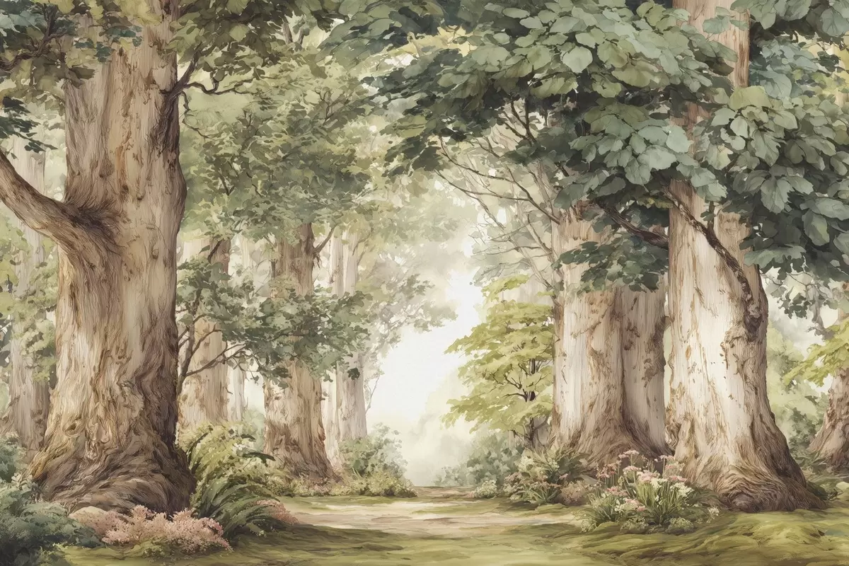 Fototapetes Meža taka starp majestātiskiem kokiem akvareļa stilā Nr. w09404