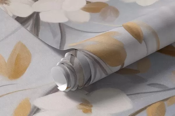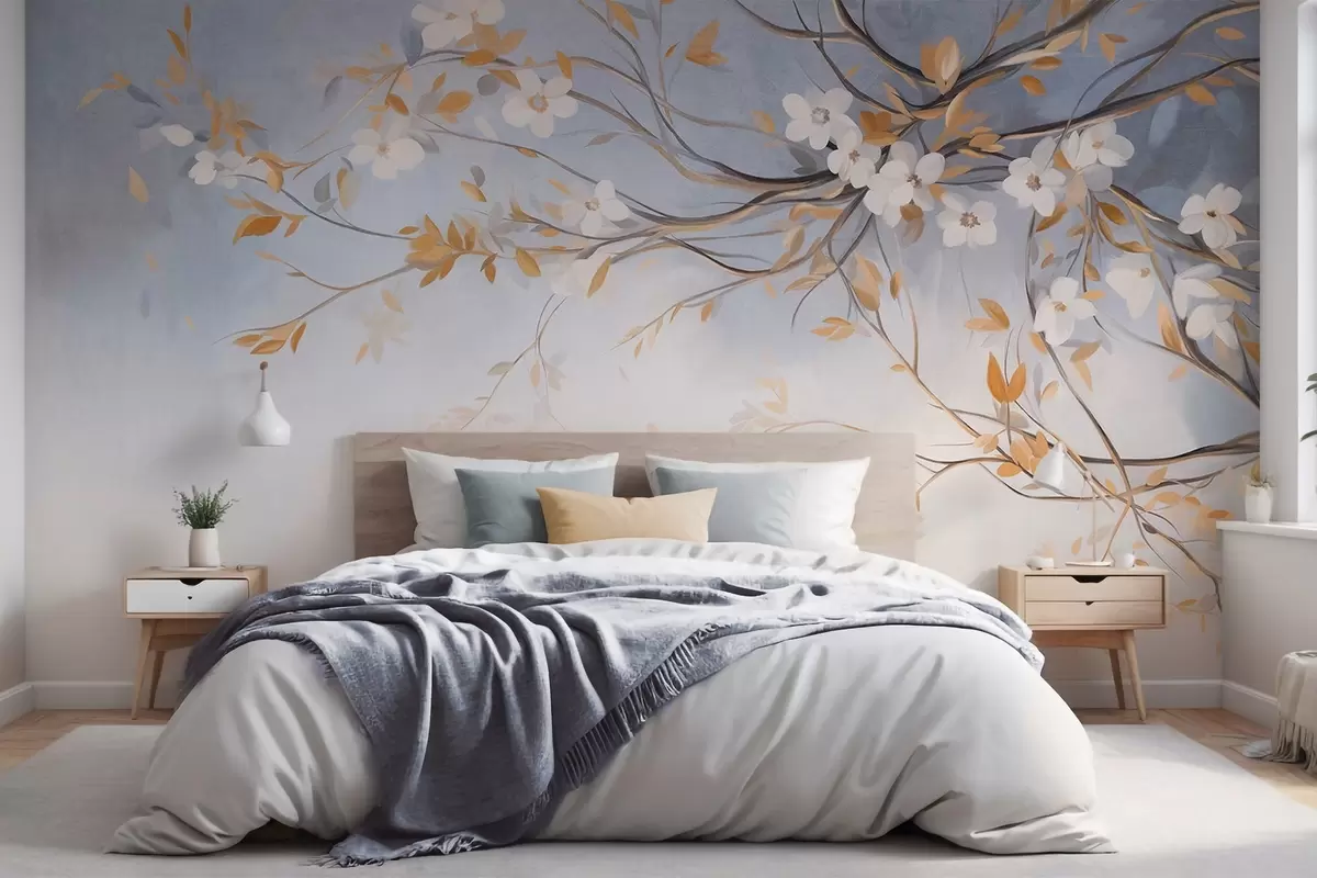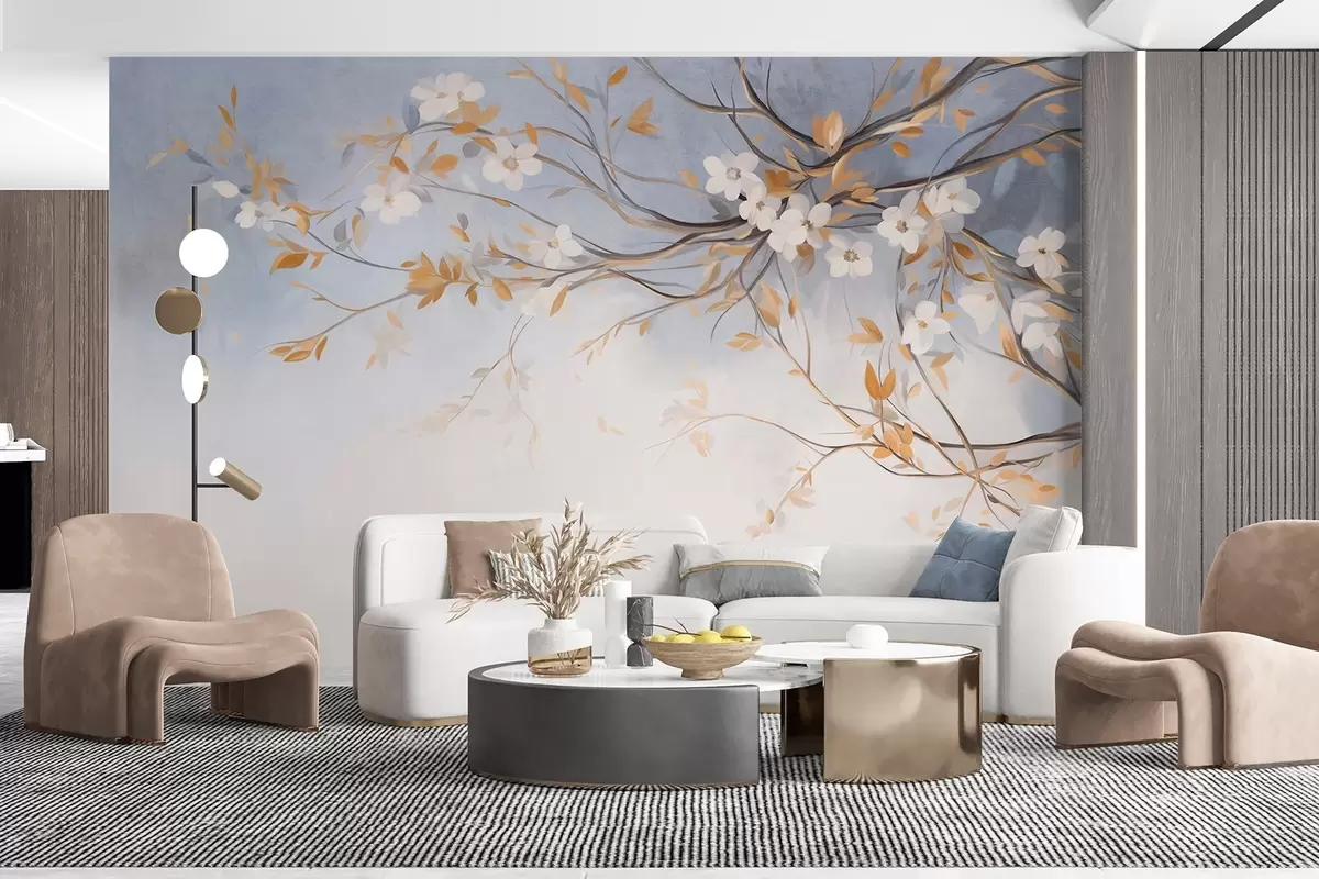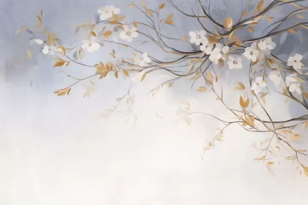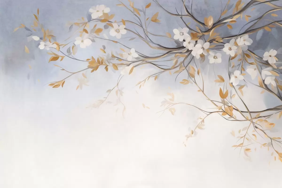 Fototapetes Baltas puķes ar oranžām lapām uz koka zara, gaiši zils teksturēts fons, delikāti otas triepieni Nr. w09415