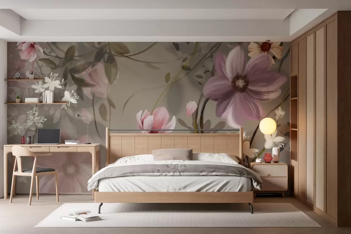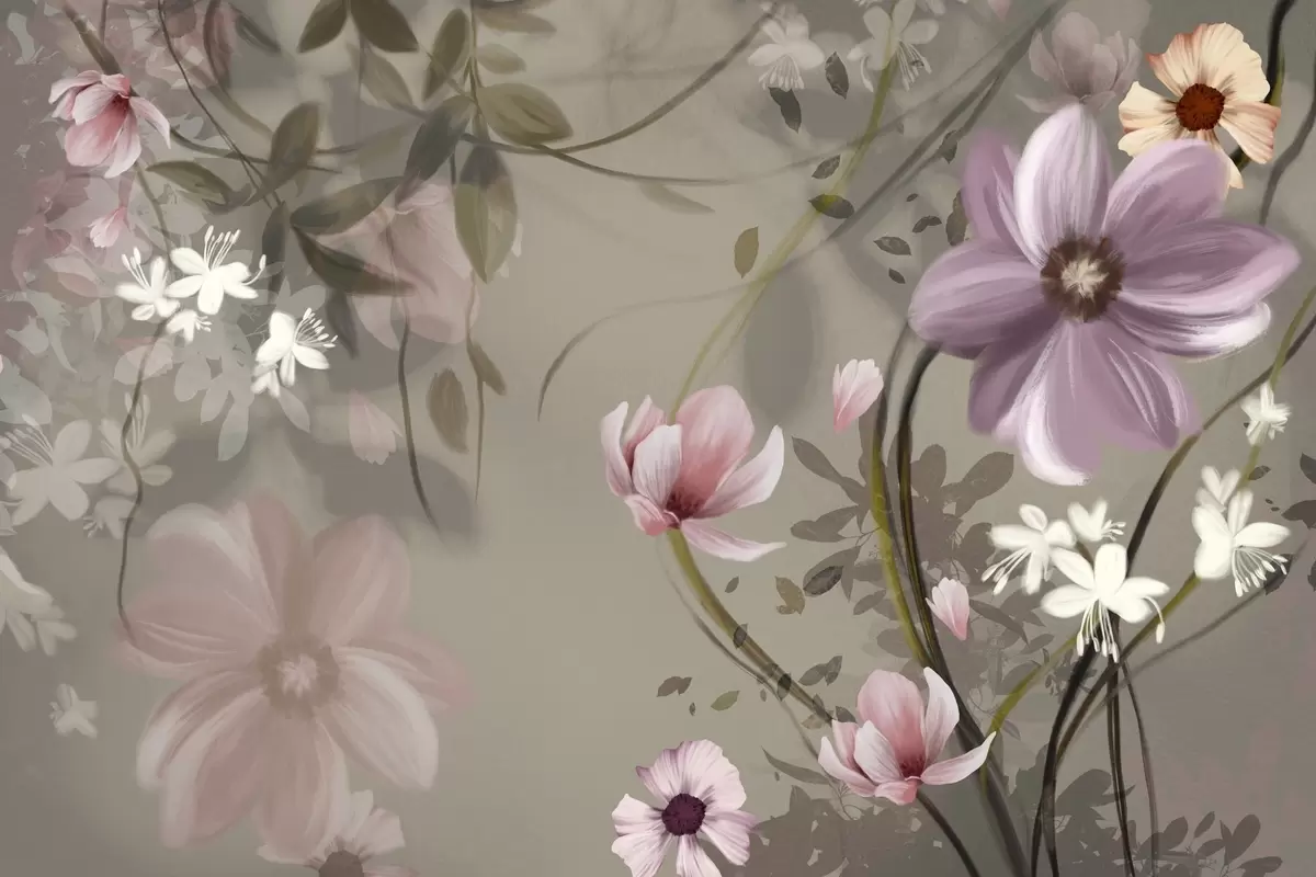 Fototapetes Rozā un baltas puķes ar brūniem stumbriem un lapām, maigs apgaismojums, klusas krāsas, ziedu kompozīcija Nr. w09417