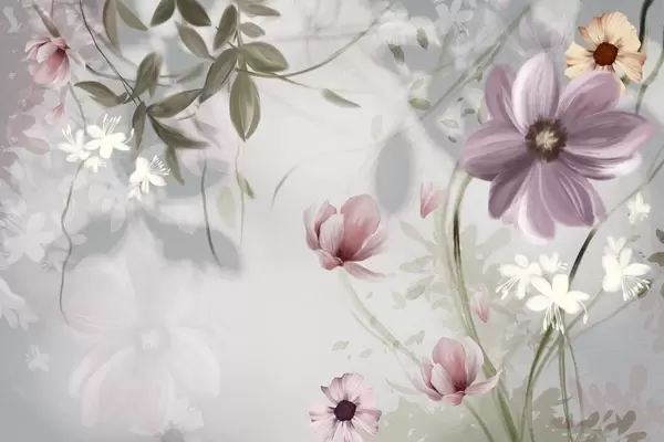 Fototapetes Rozā un baltas puķes ar zaļiem stublājiem un lapām, maigs apgaismojums, klusas krāsas, ziedu kompozīcija Nr. w09417v1