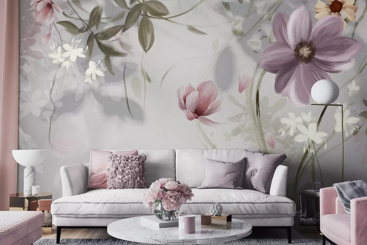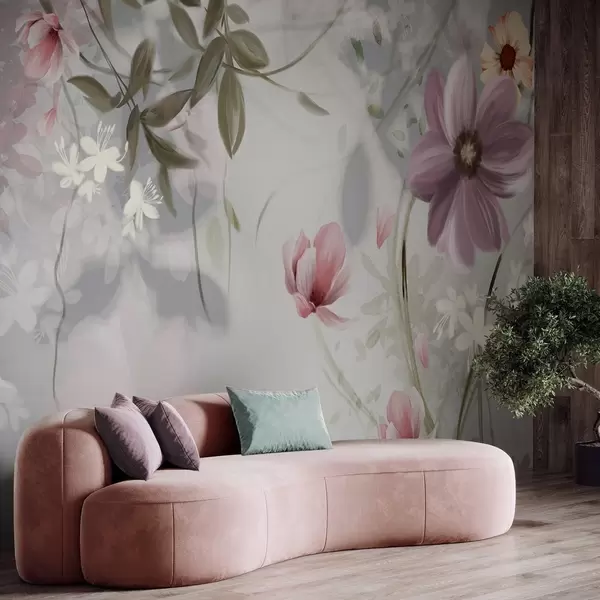 Fototapetes Rozā un baltas puķes ar zaļiem stublājiem un lapām, maigs apgaismojums, klusas krāsas, ziedu kompozīcija w09417v1