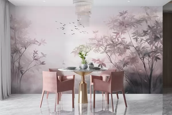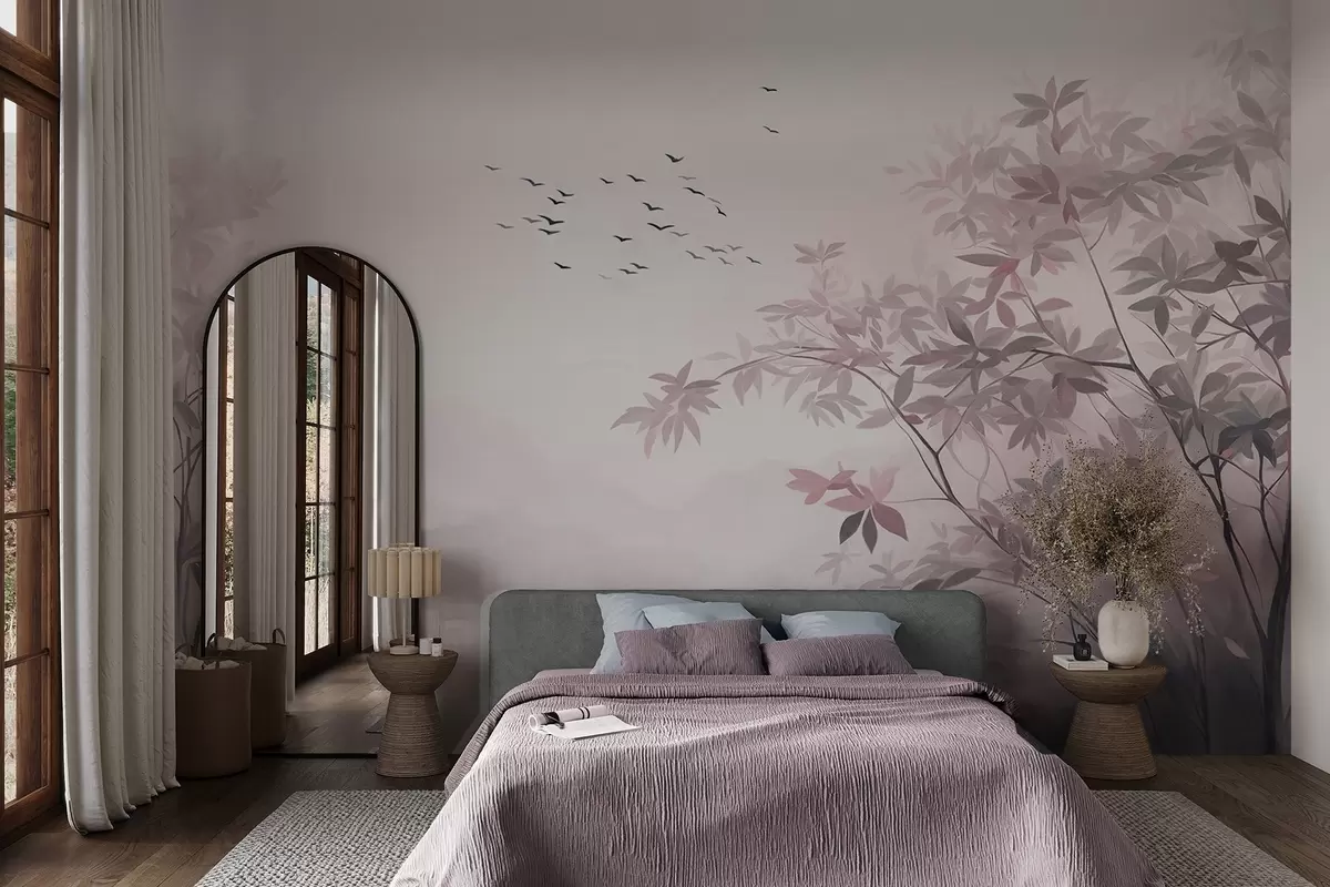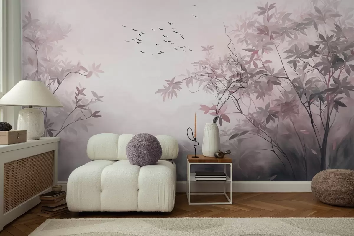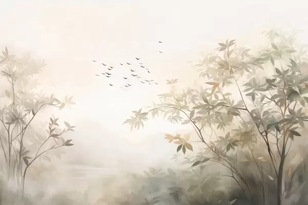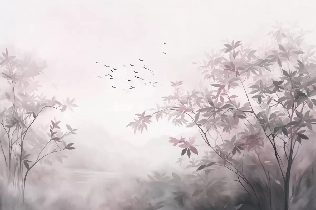 Fototapetes Teksturēts ainavas ar kokiem un putnu bars lidojot debesīs, pasteļtoņos, dabas aina Nr. w09418v1