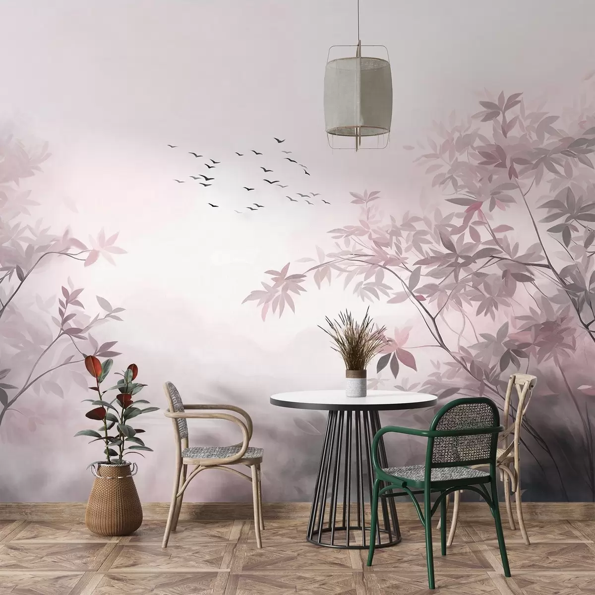 Fototapetes Teksturēts ainavas ar kokiem un putnu bars lidojot debesīs, pasteļtoņos, dabas aina Nr. w09418v1