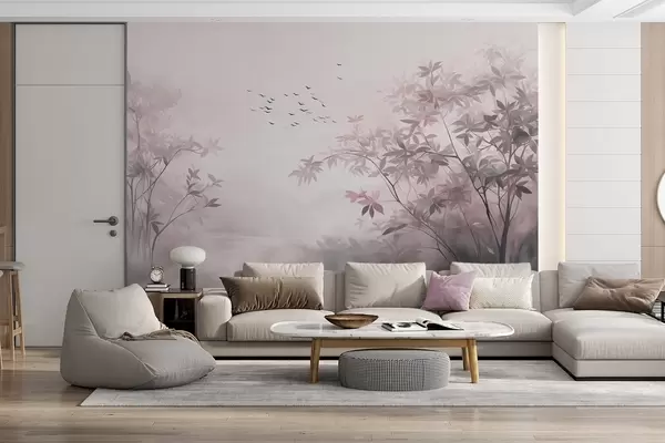 Fototapetes Teksturēts ainavas ar kokiem un putnu bars lidojot debesīs, pasteļtoņos, dabas aina Nr. w09418v1