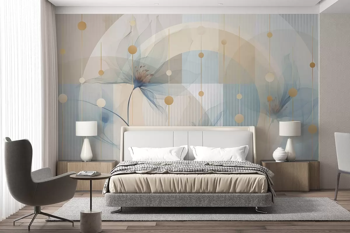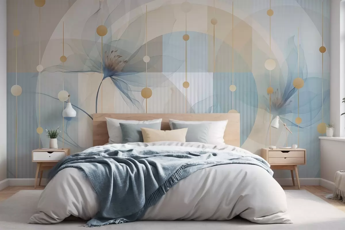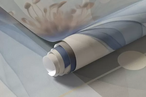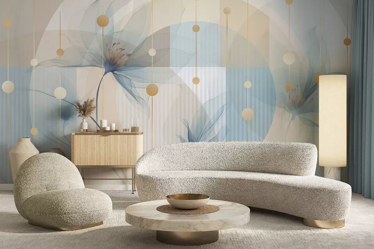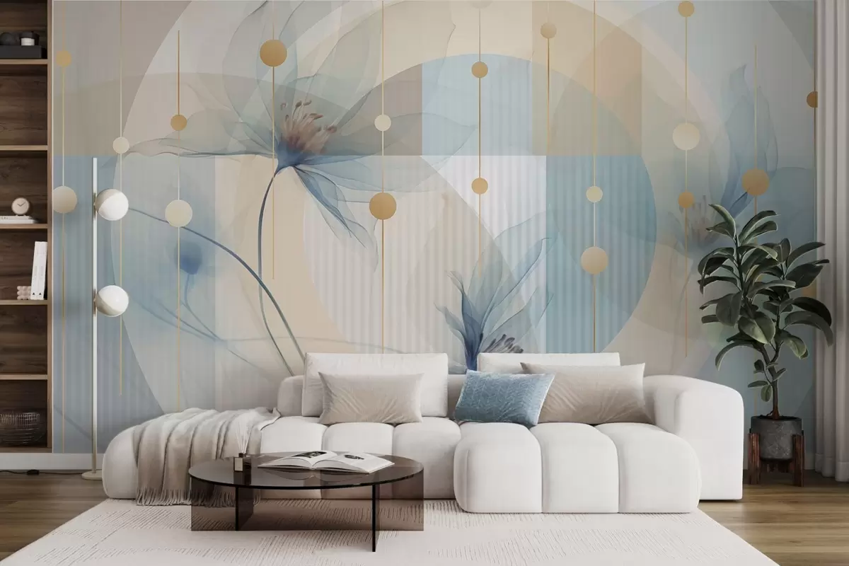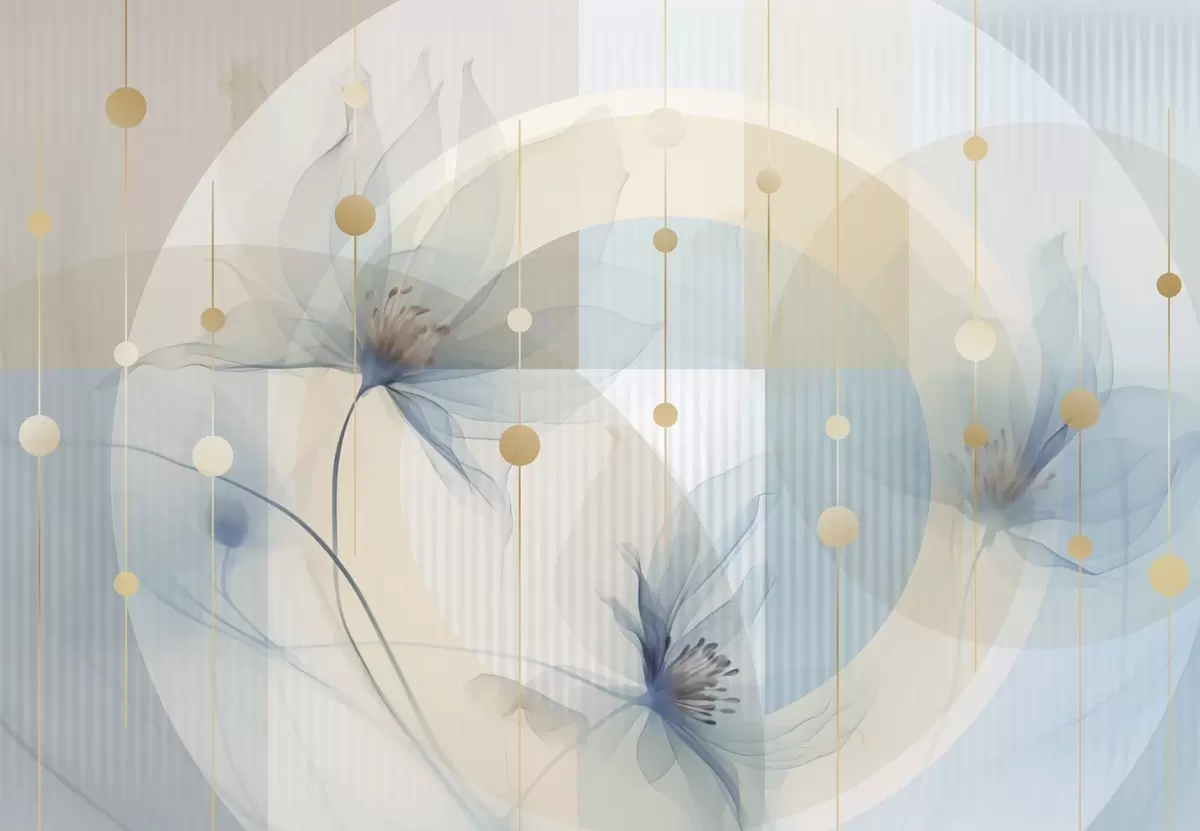 Fototapetes Abstrakti caurspīdīgi ziedi, apļi un ģeometriskas formas, pasteļtoņos zila, smilškrāsas un balta krāsu palete Nr. w09419