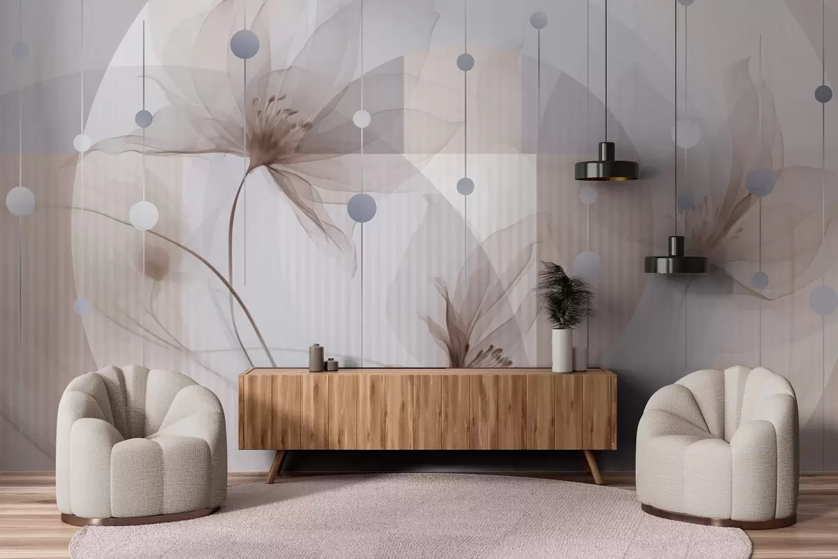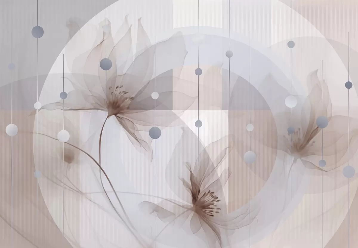 Fototapetes Abstraktas caurspīdīgas puķes, apļi un ģeometriskas formas, pasteļtoņos zila, brūna un balta krāsu palete Nr. w09419v1