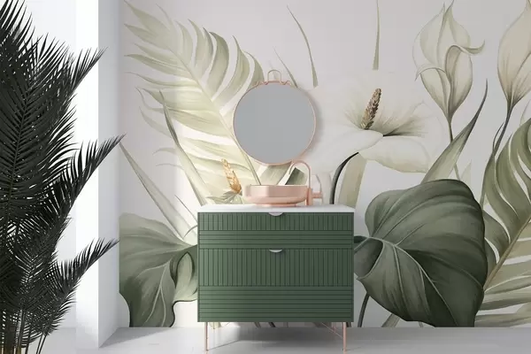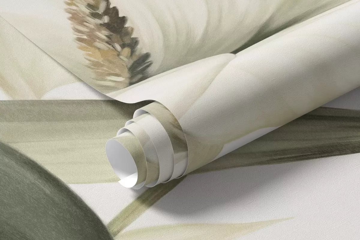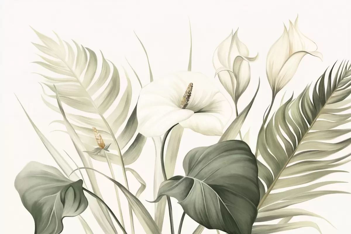 Fototapetes Baltas kalas un zaļas tropu lapas, botāniska ilustrācija, gaišs fons, vintage stils, teksturēts Nr. w09423
