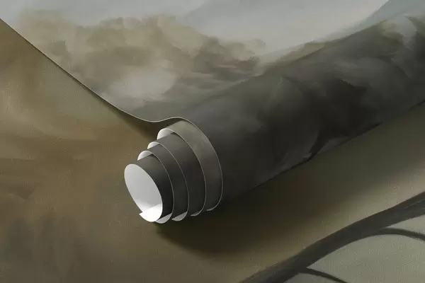 Fototapetes Miglas apklāta kalnu grēda ar kokiem, migla, apmācies debesis, klusinātas krāsas, ainavas glezniecības stils Nr. w09424