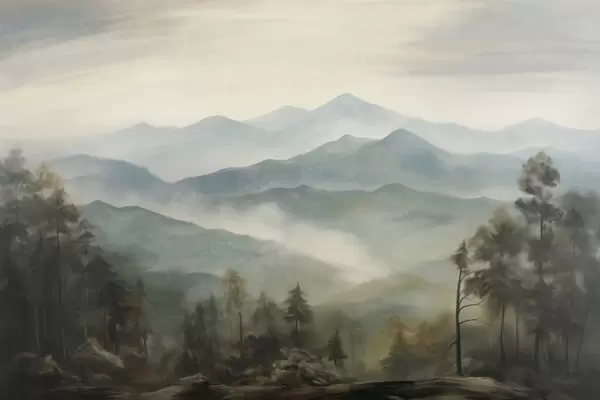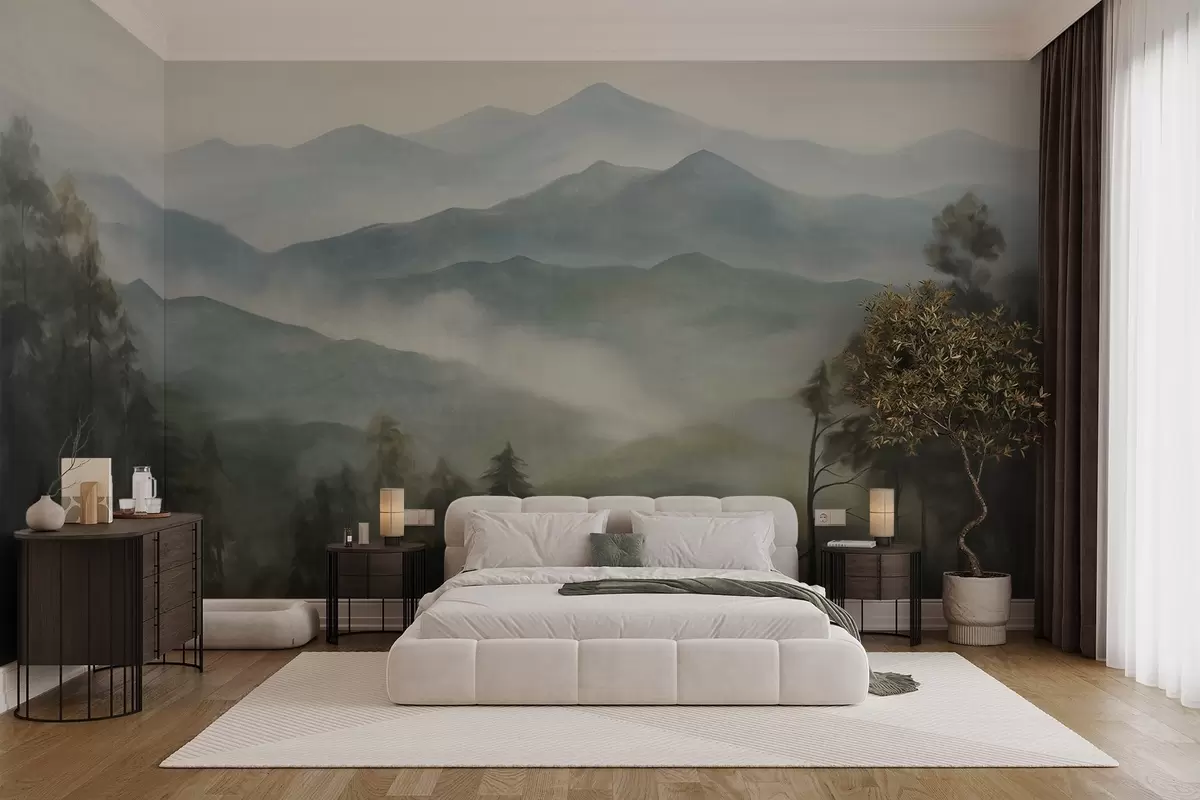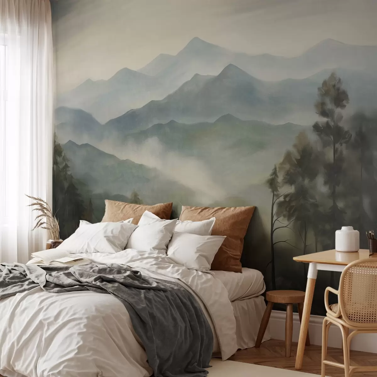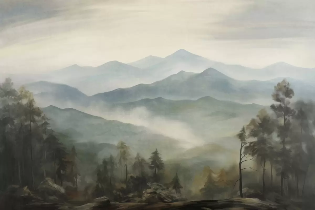 Fototapetes Miglas apklāta kalnu grēda ar kokiem, migla, apmācies debesis, klusinātas krāsas, ainavas glezniecības stils Nr. w09424