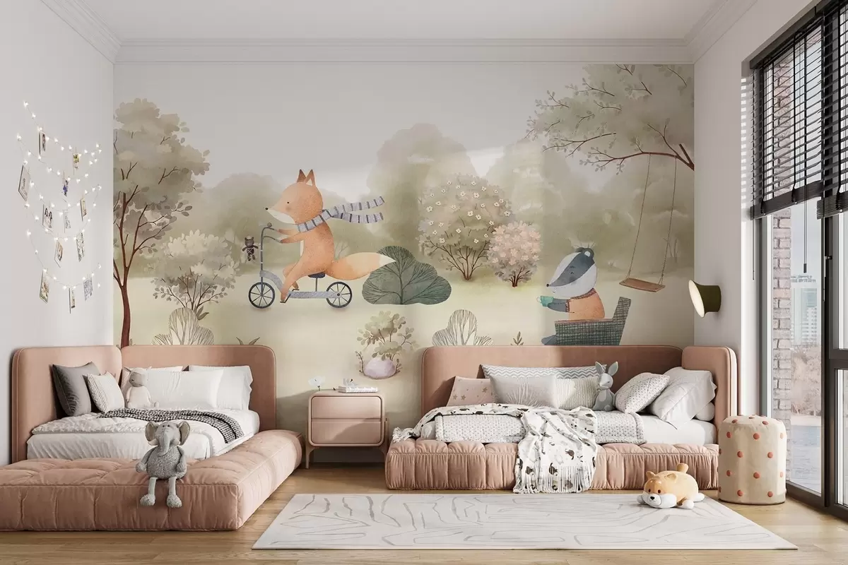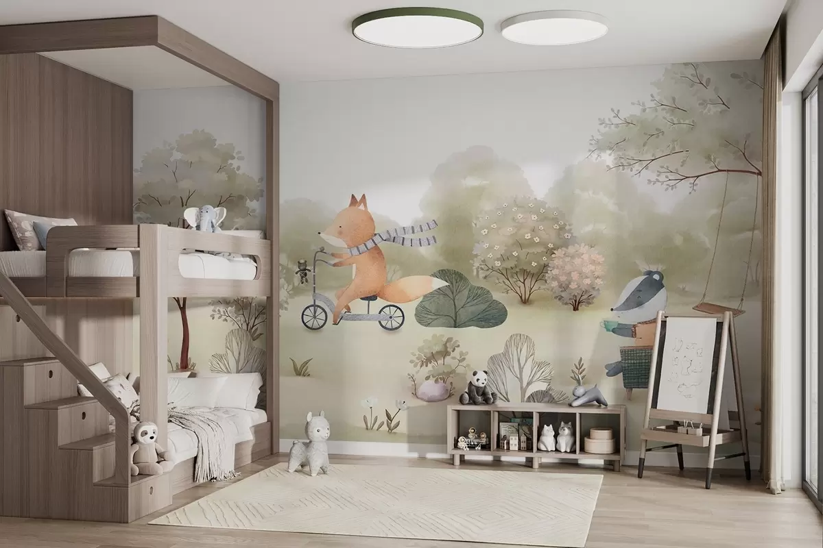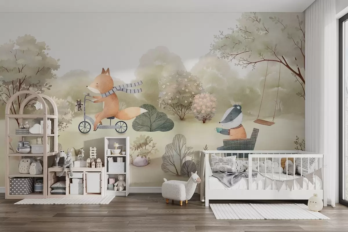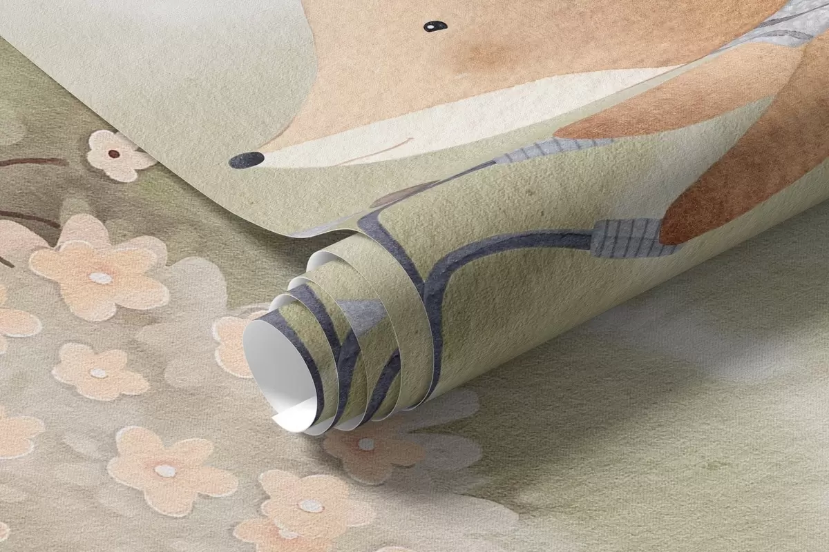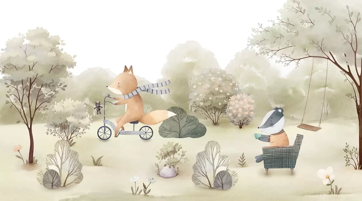 Fototapetes Lapsa uz velosipēda un āpsis ar tēju, meža dzīvnieki akvareļu stilā Nr. w09439