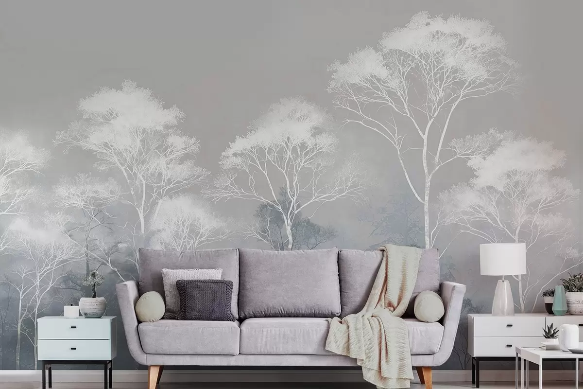 Fototapetes Minimālisma stila koki zilā un pelēkā krāsu gamā, miglā Nr. w09448