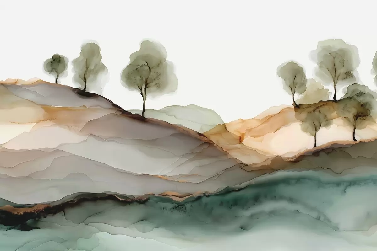 Fototapetes Abstrakts ainavas attēls alkohola tintes stilā — kalni un koki pasteļtoņos Nr. w09457