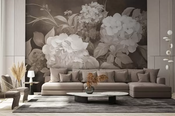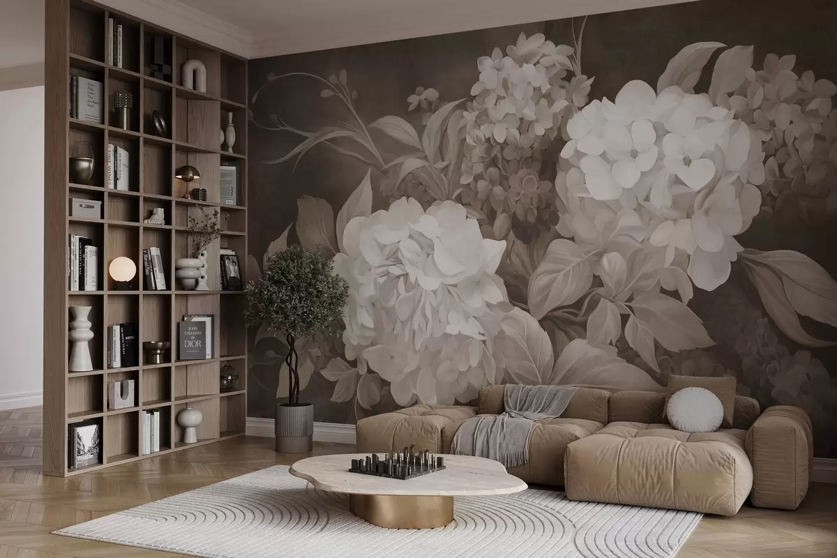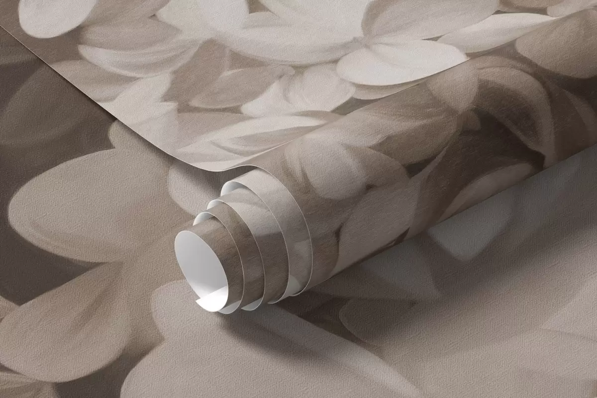 Fototapetes Teksturēta sēpijas krāsas glezna, kas imitē hortenziju ziedus ar lielām lapām, abstrakts un tumšs fons Nr. w09465