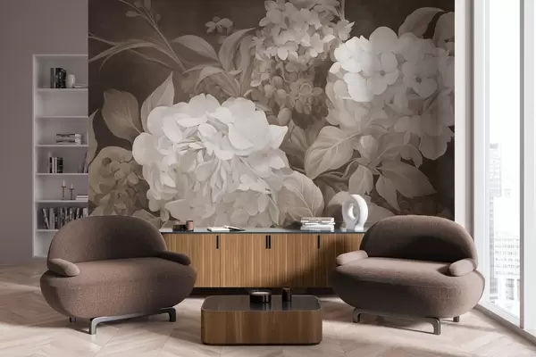 Fototapetes Teksturēta sēpijas krāsas glezna, kas imitē hortenziju ziedus ar lielām lapām, abstrakts un tumšs fons Nr. w09465