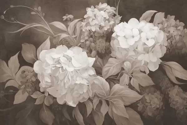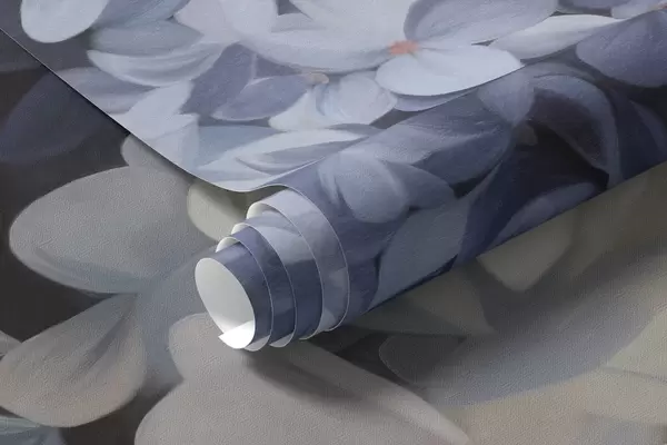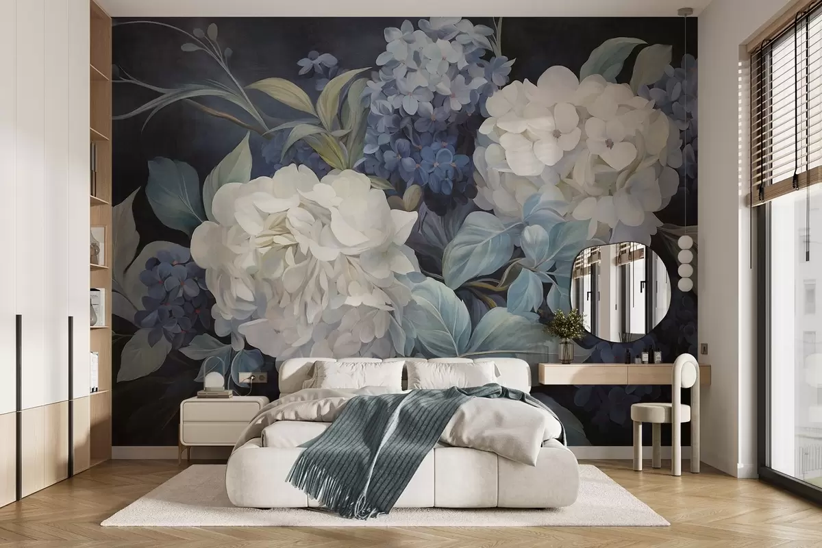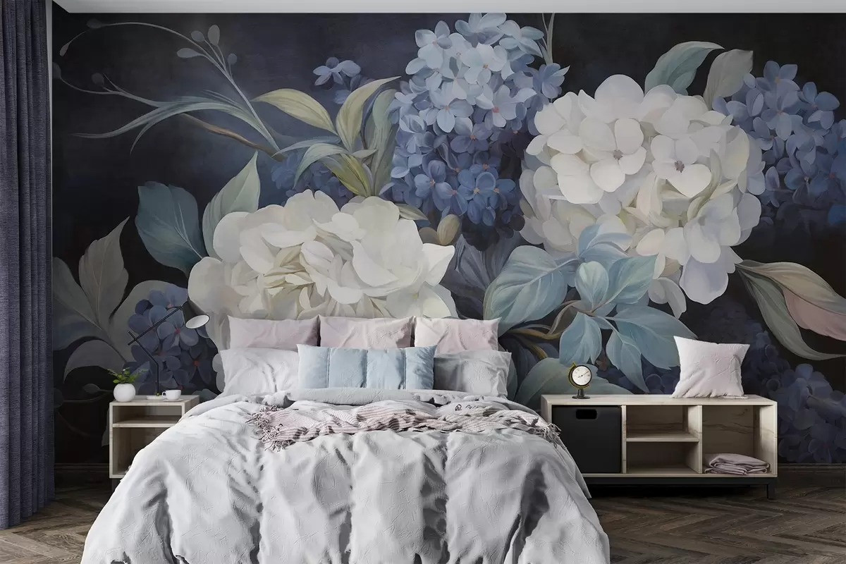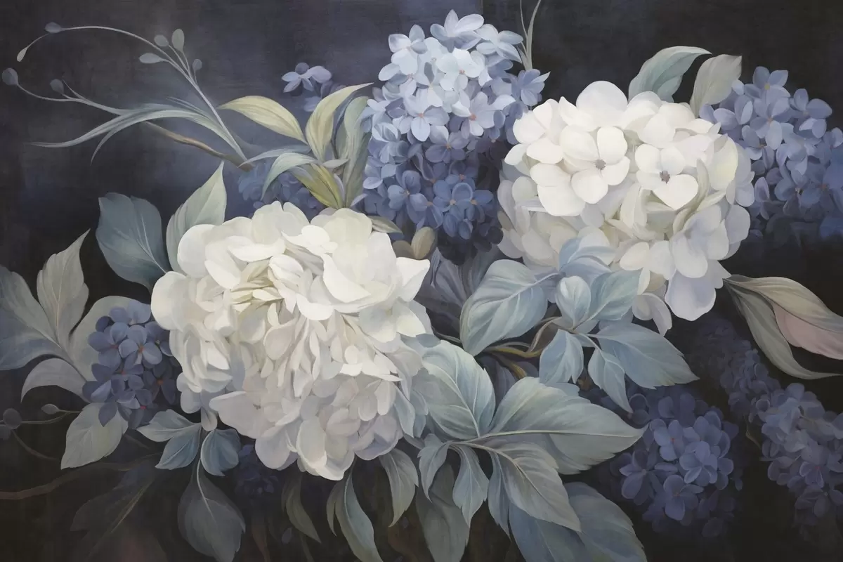 Fototapetes Teksturēta tumši zila glezna, kas imitē hortenziju ziedus ar lielām lapām, abstrakts un tumšs fons Nr. w09465v1