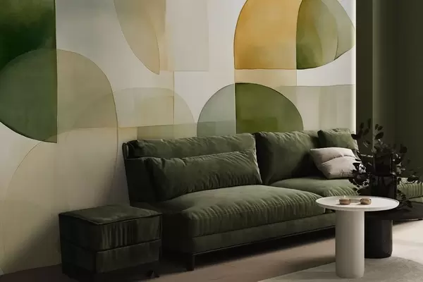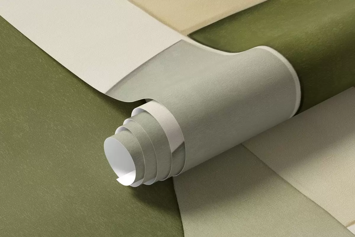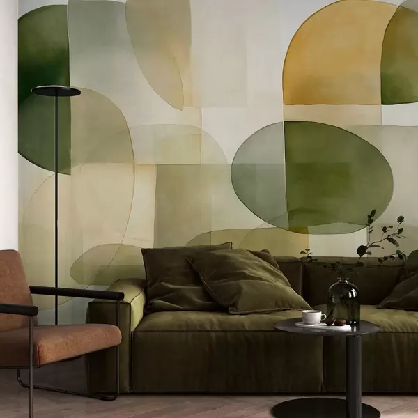 Fototapetes Abstraktas teksturētas formas zaļā un dzeltenā krāsā, klusināti toņi, minimālistiska kompozīcija, neitrāls fons Nr. w09467