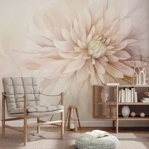 Fototapetes Gaiši rozā dālija ar daudzām ziedlapām, maiga tekstūra, pasteļtoņos fons ar zaļganu un smilškrāsas nokrāsu Nr. w09470