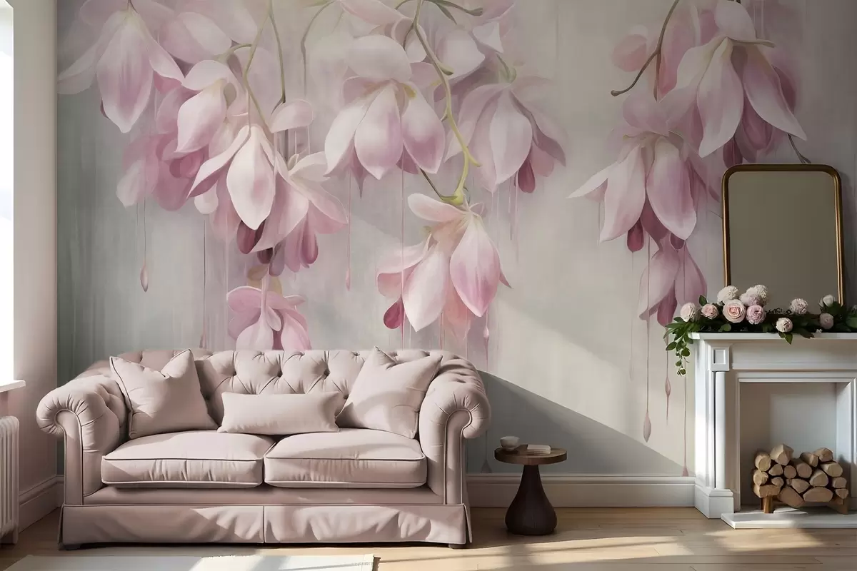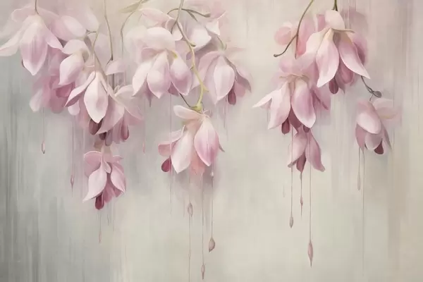 Fototapetes Karājošies rozā ziedi, gaiši pelēks fons, ziedu tekstūras kompozīcija, botānikas māksla, pasteļtoņi Nr. w09471