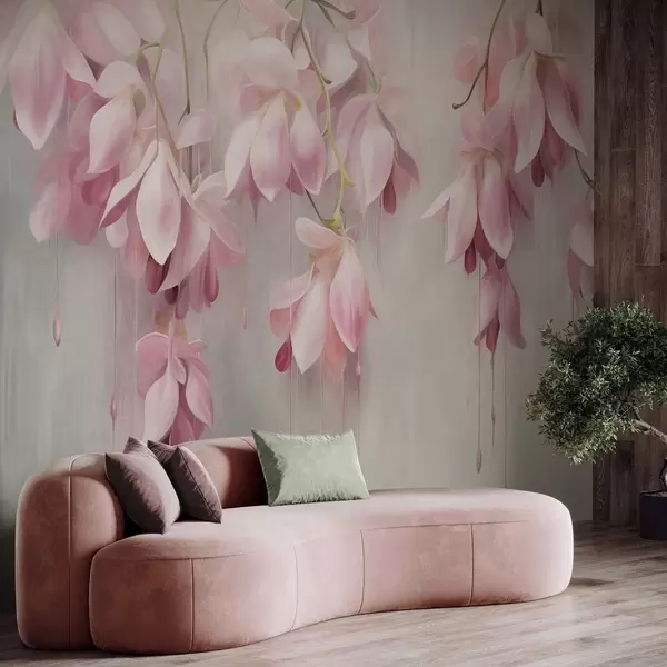 Fototapetes Karājošies rozā ziedi, gaiši pelēks fons, ziedu tekstūras kompozīcija, botānikas māksla, pasteļtoņi Nr. w09471