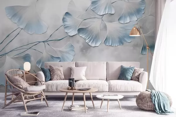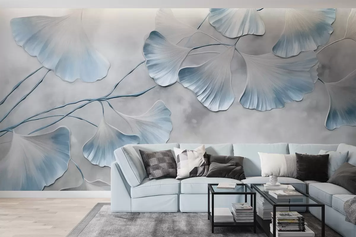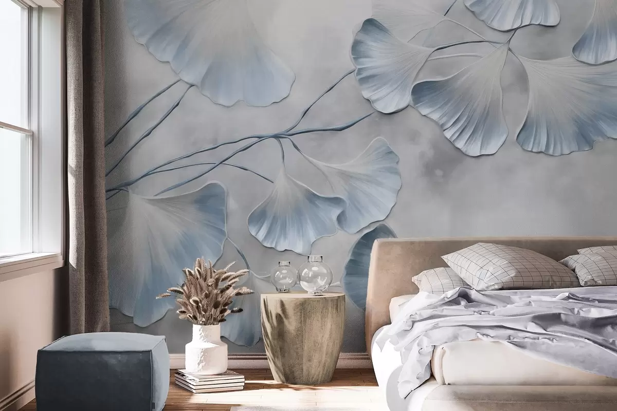 Fototapetes Ginkgo biloba lapas ar ziliem malām uz zara, pelēks teksturēts fons, elegants un minimālisma dizains Nr. w09472v1